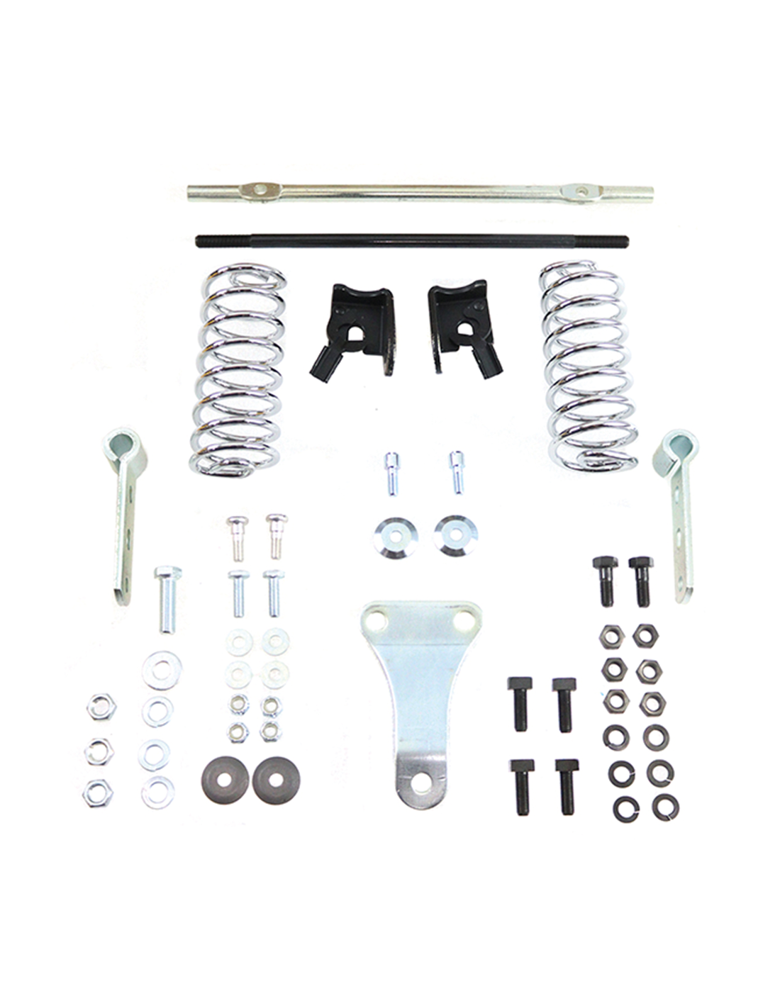 V-TwinKit molla sella ausiliaria perFL 1965-1978, utilizzabile anche sui modelli 1979-1984. Contiene perno della barra trasversale con distanziali (OEM 52605-65), supporti della molla (OEM 52577-65AL), kit di montaggio della molla della sella (OEM 52608-65), giogo (OEM 52596-65) e elementi di fissaggio