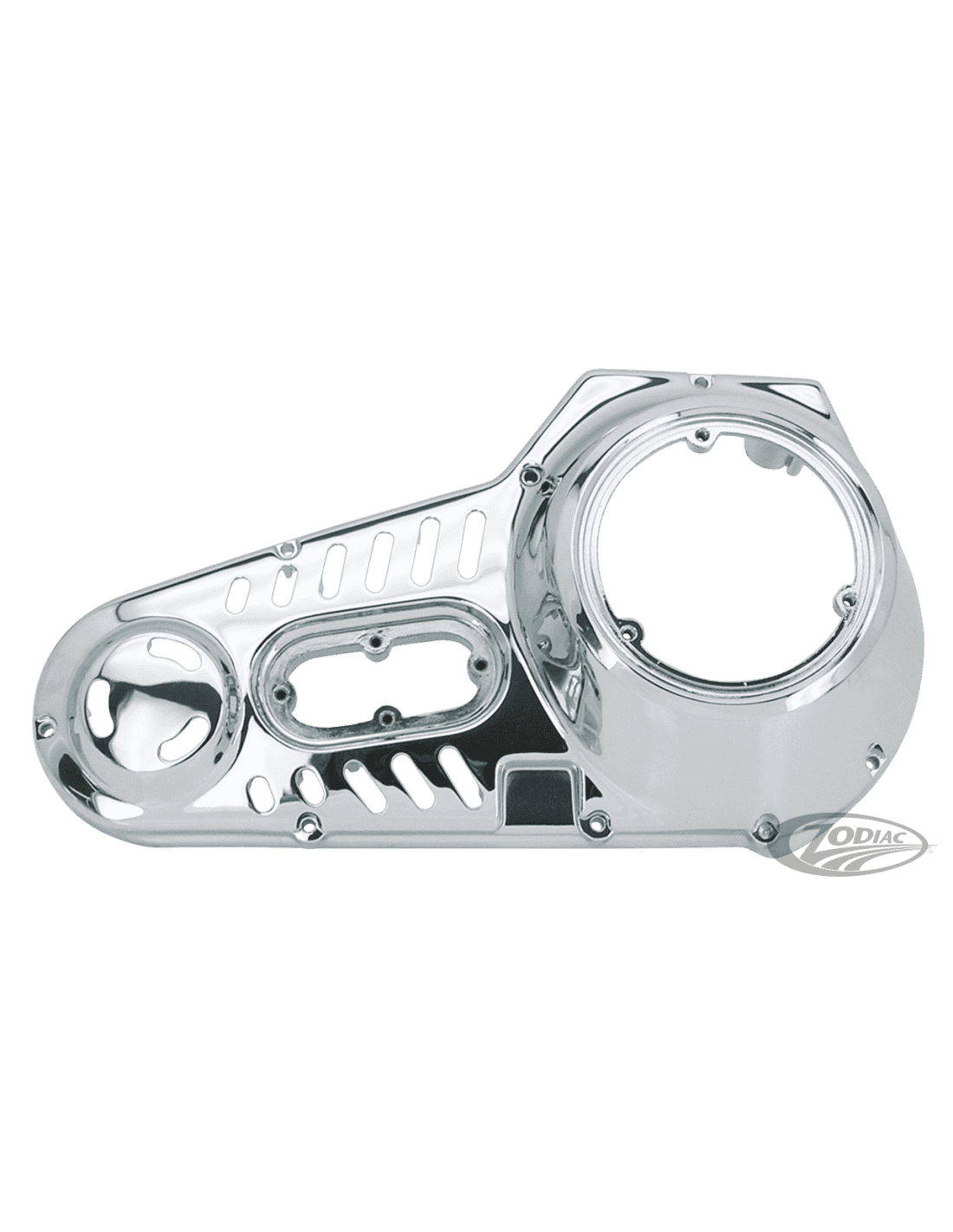 Zodiac (Genuine Zodiac Products)Queste coperture ventilate sono progettate appositamente per chi usa primarie una cinghia stretta da 1 3/4". Le fessure aumentano la circolazione dell'aria mantenendo la cinghia fresca e aumentandone la durata. Per Big Twin 4 marce dal 1970 al 1984 e Softail 5 marce fino al 1988. La copertura è pronta per essere installata su tutte le primarie a 8 fori, ma ha anche la predisposizione per il nono foro se necessaria L'installazione sui modelli FL con pedane centrali richiede la foratura e filettatura della piastrina di montaggio nello spazio di fronte alla copertura dell'ispezione. Il cuscinetto ad aghi per l'alberino dell'avviamento è stato ordinato separatamente.
