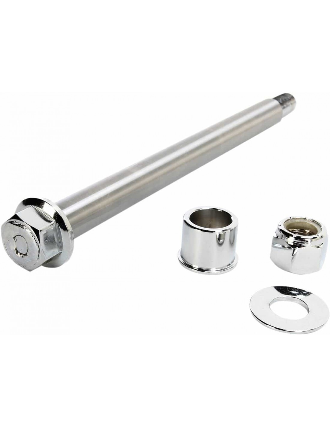 Drag SpecialtiesKit perno ruota anterioreUna brillante finitura cromata su perno ruota e minuteria abbellisce la moto I kit includono perno ruota, distanziali, dadi e rondelle < /br>Il perno ruota per FXSTS viene fornito solo con distanziale destro.