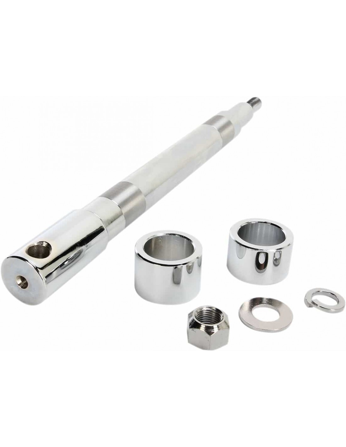 Kit perno ruota anterioreUna brillante finitura cromata su perno ruota e minuteria abbellisce la moto I kit includono perno ruota, distanziali, dadi e rondelle < /br>