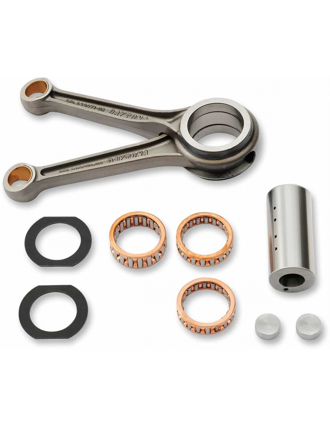 Biella completaSostituti resistenti, perfetti per motori di serie Soddisfa o supera le specifiche OEM Con tutte le dotazioni e pronto per essere installato Il set completo include una boccola albero a due fori, piatti molla in alluminio, cuscinetti, dadi e bielle in acciaio trattato termicamente e forgiato Controllare la distanza del volano.