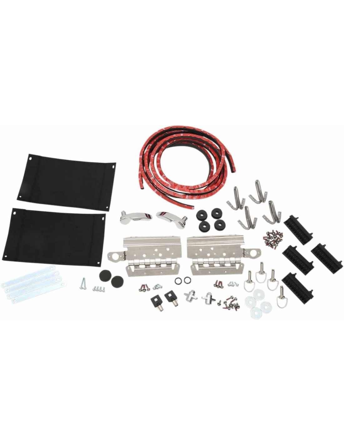 Kit materiale di montaggio per valigie lateraliContiene tutte le parti e la minuteria necessaria per installare borse laterali e cerniere per relativi coperchi l kit include cerniere coperchio, coperchio guarnizioni , cordini, impugnature ad aggancio con guarnizioni, agganci, perni a sgancio rapido con anello, gommini isolanti, rondelle, set di chiusura cromata con chiavi e cuscini Compatibile con tutte le borse laterali rigide 14-17 stile OEM Comò Piastre di fissaggio per cerniera, cavi degli attuatori e agganci non sono inclusi e devono essere acquistati a parte.