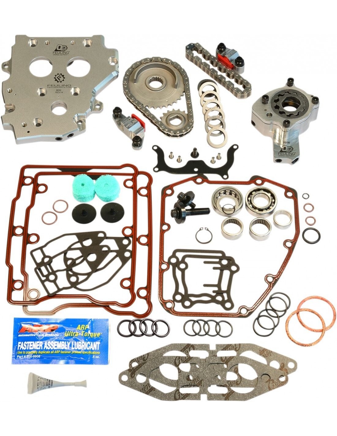 Feuling Oil Pump Corp.Kit di conversione tendicatena idraulico per distribuzione oe+®i kit di conversione tendicatena per includere i componenti necessari per passare dai sistemi meccanici di distribuzione a catena vecchia versione 99-06 a quelli idraulici 07- 16 ultimo modelloil kit include una pompa olio e una piastra albero a camme in billet feuling oe+, tendicatena idraulici in billet feuling, catene di distribuzione, corone, distanziali per allineamento corona, cuscinetti timken®/feuling, le guarnizioni necessarie, o-ring,made in usai kit di guarnizioni scatole bilancieri sono inclusi in modo che si possano riutilizzare le aste di spinta monopezzo di fabbrica. li>non compatibile con alberi a camme dotati di chiavetta