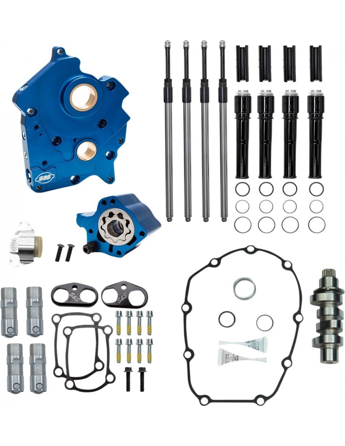 Kit carter camme per motori m-eightle spine passanti possono essere rimosse a fini di manutenzione sezioni di ritorno indipendenti per l'alloggiamento per volano e il carter camme protezione da detriti in entrambe le cavità di passaggio olio capacità di flusso aumentata in mandata e in ritorno la valvola di depressurizzazione regolabile può essere regolata con l 'unità installata nel motore lavorazione di precisione in alluminio billet punterie di altissima qualità s&s il magnete nel carter camme impedisce l'ingresso di detriti nella pompa olio consentono di aumentare la stabilità delle punterie in condizioni di alzata maggiorata e alti regimi include tutte le guarnizioni, i cuscinetti e il materiale per il montaggio necessari l'installazione made in the usa 465 è una camma di coppia ideale per applicazioni touring.