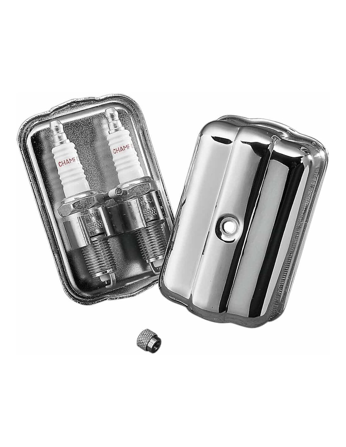 Drag SpecialtiesPortacandele cromatoRiproduzione cromata dei box che venivano montati sulle prime Panhead, rivisitato per poter accogliere anche le candele con elevata lunghezza di avvitamento dei modelli Shovelhead più recenti Il supporto in metallo, da avvitare al tubo telaio posteriore situato dietro il serbatoio in tutti i modelli Big Twin, può contenere anche due candele in più (non in dotazione) Si fissa con una vite a testa zigrinata