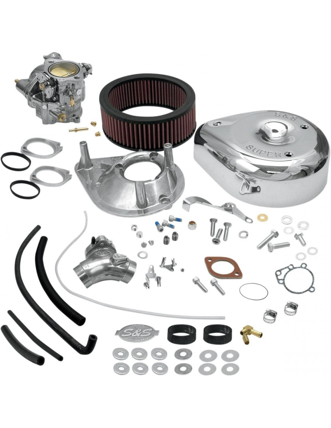 S&S CycleKit carburatore super eil kit carburatore include un carburatore con vasi di erogazione del carburante e viti del minimo aggiornati, gruppo filtro dell'aria a goccia, collettore, hardware di montaggio, tubo del carburante, fascette, tubo di troppo pieno, un intermedio extra e due getti principali, tubo voes (se applicabile), istruzioni di installazione e getto gola da 1-7/8" sulla farfalla e un venturi da 1-9/16" ed è consigliato per l'uso con motori fino fino a 100 pollici cubi prodotto negli usa per motori big twin evolution '84-'92. Richiede l'uso di un gruppo acceleratore a due cavi con apertura/chiusura. Compatibile con cavi di serie.