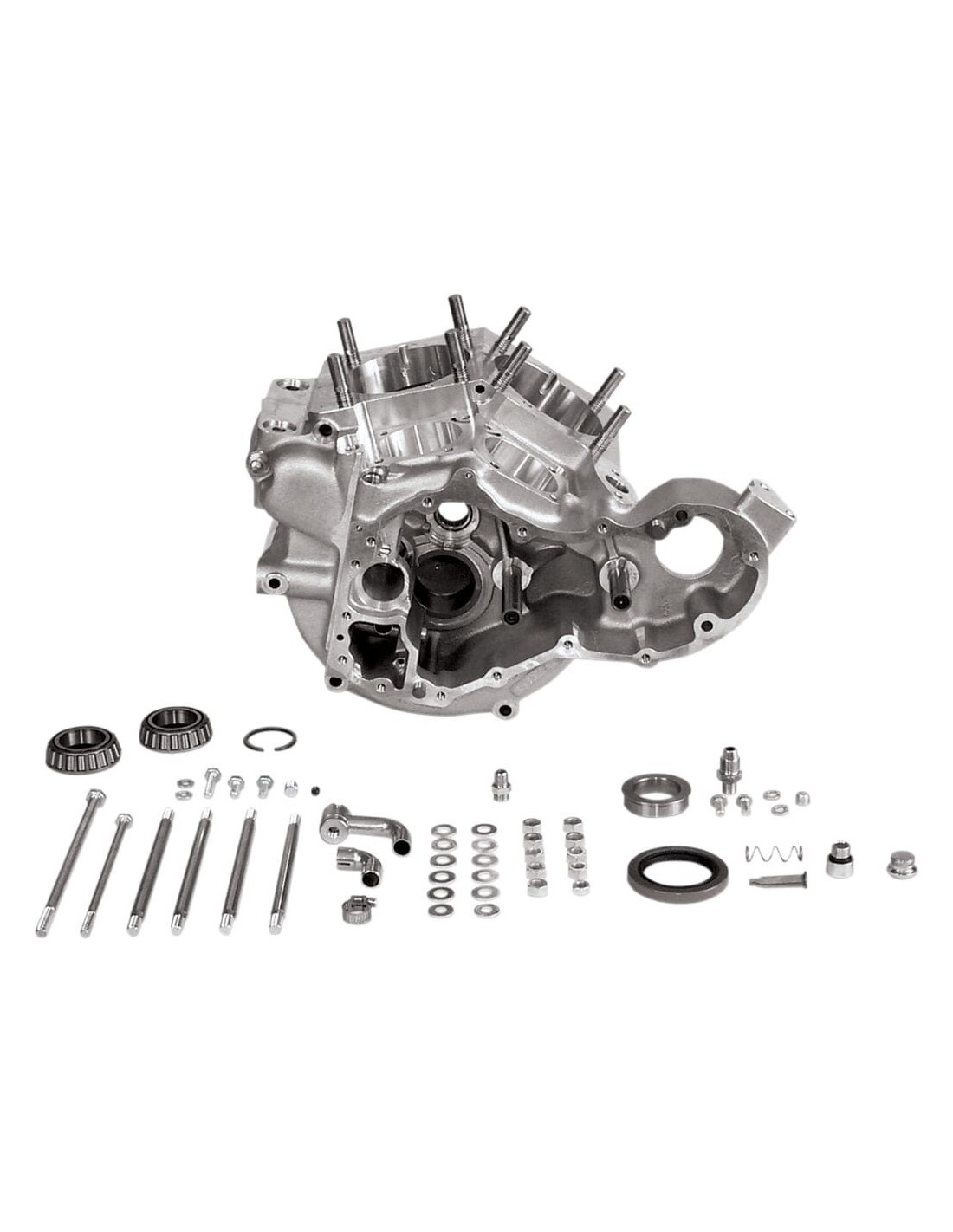 S&S CycleCarter motore generatore super stockinclude le viti del carter motore, le rondelle ei dadi, i perni di montaggio cilindro, il tappo del foro di fasatura, il tappo di sfiato magnetico, diversi attacchi per il filtro aria e il tubo olio, la molla e il tappo del filtro olio della testata, il usa i cuscinetti albero della corona stile timken ei cuscinetti del pignone del 1958 e successivi (non compatibile con volani del 1957 e precedenti) gli anelli di guida dei cuscinetti sono tutti lavorati in linea e la cavità del filtro aria è lavorata con precisione al fine per ottimizzare la fasatura del filtro aria per un flusso massimo dell'olio lavorati per cilindri da 3,4375" e 1/4"-20 filettati per coperture ingranaggio, pompa olio, guide punterie, indicatore tempi e ottimizzazione indicatore tempi i modelli 66-69 usano la primaria interna in lega 66-69 con fori per viti di montaggio alternatore da 5/16" made in usa il kit ingranaggi carter alternatore ( include ingranaggio di azionamento interruttore, ingranaggio folle, ingranaggio interruttore e spessori) e gli alberi devono essere acquistati separatamente