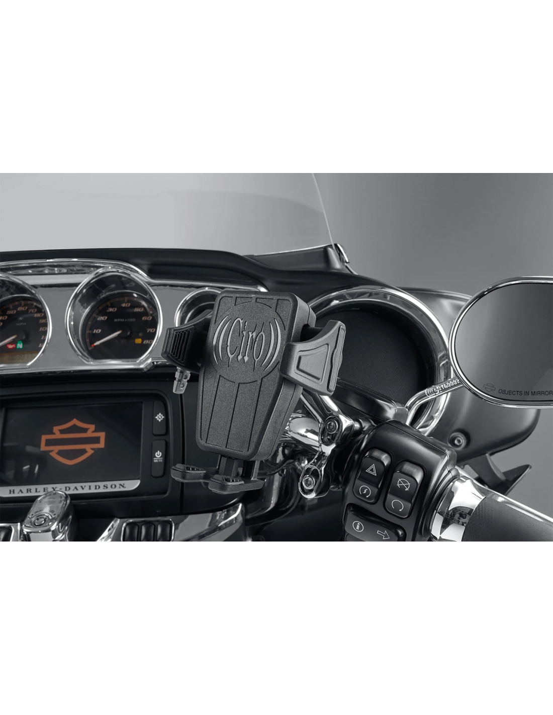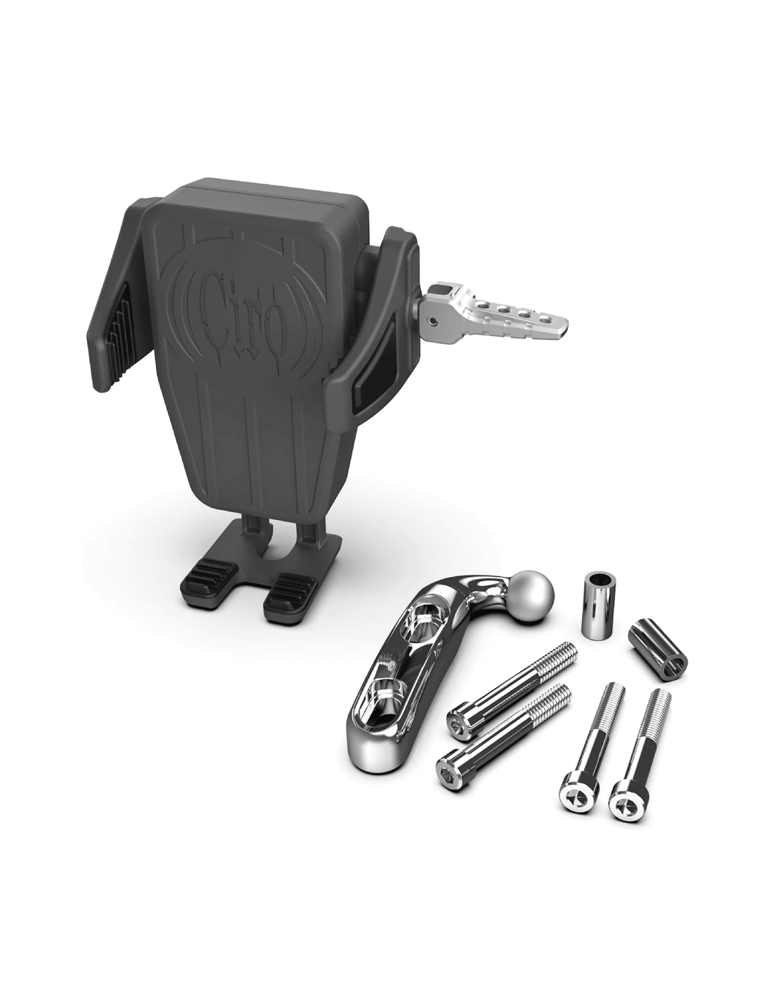 Questi accessori ti permettono di montare il tuo telefono o la tua macchina fotografica su qualsiasi perno a sfera Ciro. Ha modelli di bulloni e supporti per i più comuni supporti per telefoni e fotocamere. Quando non vuoi preoccuparti di scaricare la batteria del tuo telefono durante la  guida, ti suggeriamo il Ciro Premium Smartphone attacco con la sua spina USB integrata da 1,3 amp, in modo da poter caricare mentre guidi usando il cavo USB del tuo dispositivo. Il CyberCharger è meglio per te se hai uno smartphone che supporta la ricarica wireless. I supporti Budget e Premium si adattano a dispositivi da 2 1/8" a 3 1/2" (da 54 a 89mm) di larghezza, il CyberCharger prende dispositivi da 2 3/8" a 4" (da 60 a 102mm) di larghezza. Per le videocamere d'azione abbiamo un adattatore specifico disponibile.
