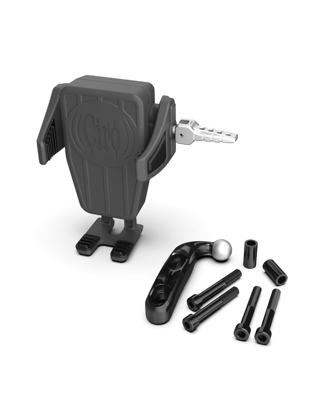 Ciro 3DQuesti accessori ti permettono di montare il tuo telefono o la tua macchina fotografica su qualsiasi perno a sfera Ciro. Ha modelli di bulloni e supporti per i più comuni supporti per telefoni e fotocamere. Quando non vuoi preoccuparti di scaricare la batteria del tuo telefono durante la guida, ti suggeriamo il Ciro Premium Smartphone attacco con la sua spina USB integrata da 1,3 amp, in modo da poter caricare mentre guidi usando il cavo USB del tuo dispositivo. Il CyberCharger è meglio per te se hai uno smartphone che supporta la ricarica wireless. I supporti Budget e Premium si adattano a dispositivi da 2 1/8" a 3 1/2" (da 54 a 89mm) di larghezza, il CyberCharger prende dispositivi da 2 3/8" a 4" (da 60 a 102mm) di larghezza. Per le videocamere d'azione abbiamo un adattatore specifico disponibile.