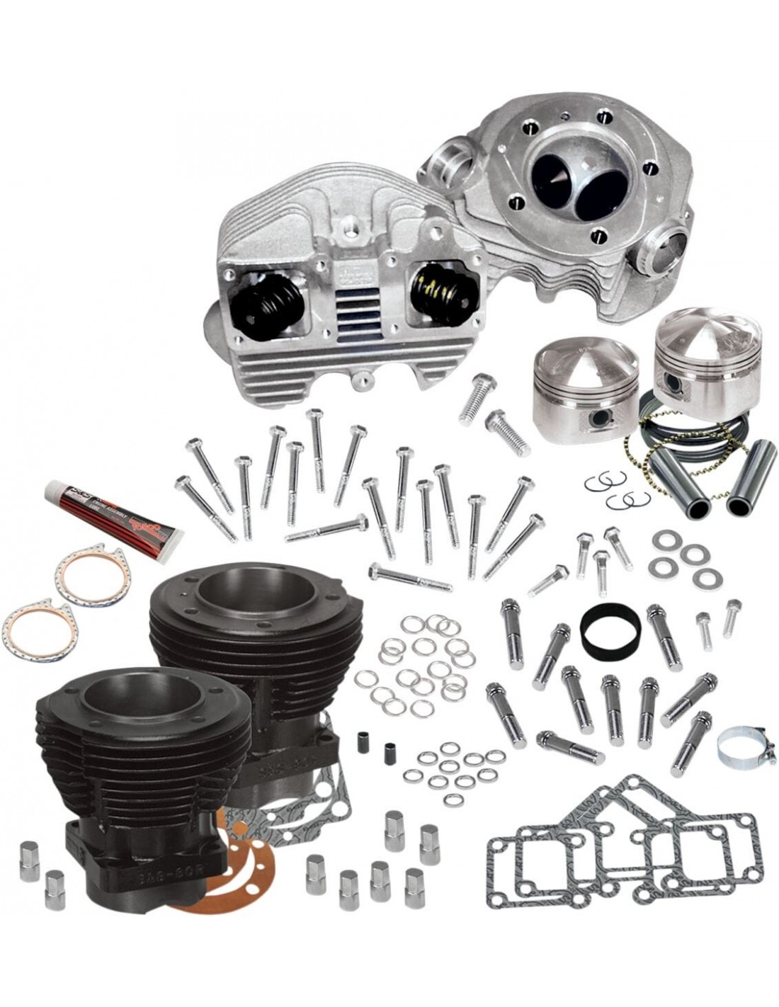 S&S CycleKit testatainclude un kit di teste cilindro stile s&s shovelhead, una coppia di cilindri s&s con foro di serie (3-7/16" per motori 74" o 3- 1/2" per 80"), pistoni con altezza di compressione standard 8:1 forgiati completi di segmenti e spinotti, fascette di raccord i pistoni sono premontati ai cilindri, cosicché non è necessario lavoro a macchina ei i tempi di inattività sono brevissimi made in usa