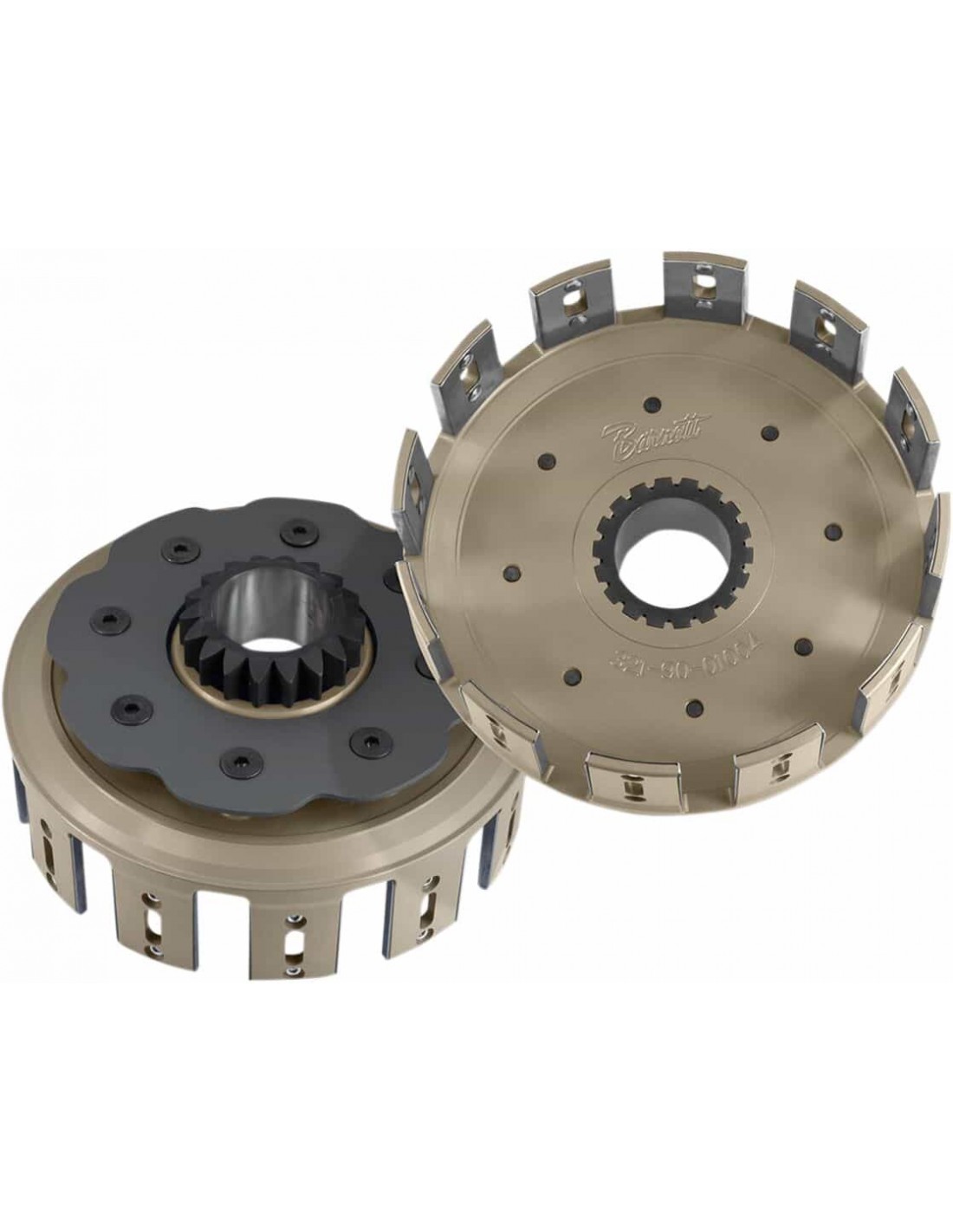 BarnettCestello frizione in alluminio billetI cestelli sono lavorati a CNC in alluminio billet 2024 T-3, mentre i piatti sono realizzati in alluminio billet 6061 T-6 per una maggiore durata e un ciclo di vita della frizione più lunga I cestelli utilizzano inserti guida in acciaio inossidabile nei punti in cui i denti del disco frizione entrano in contatto con il cestello; per il fissaggio della piastra base vengono usate viti di classe 8 Made in the USA