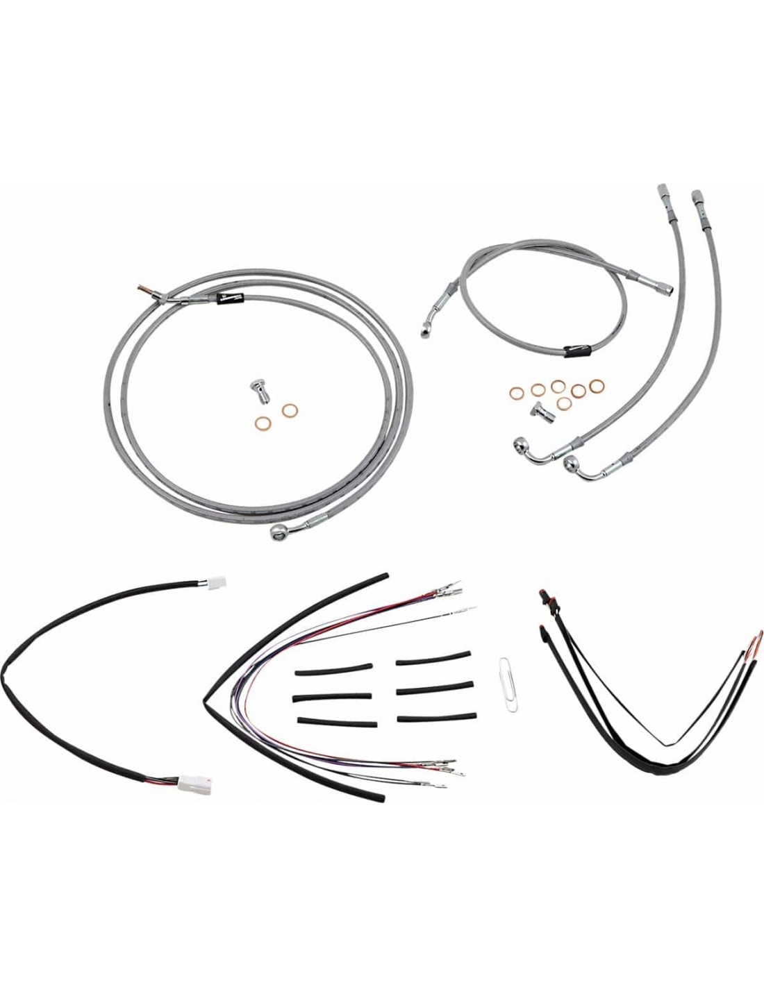 Burly BrandKit tubo freno/cavo manubrio intrecciato in acciaio inossidabile completoKit di installazione completo per Burly Ape Hanger I kit includono tubo freno prolungato, cavo/tubo frizione prolungato, cavi di comando/chiusura gas prolungati come richiesto e tutto il cablaggio necessario I tubi freno presentano un rivestimento interno in PTFE e una treccia esterna in acciaio inossidabile resistente I kit Dresser riutilizzano il cablaggio Ride-By-Wire di serie I kit si basano sull'utilizzo di rialzi da 2” con manubri in stile Ape Hanger