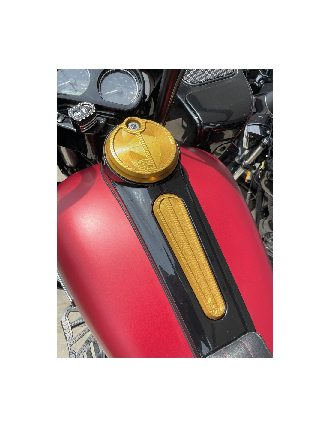 Per Electra Glide, Tour Glide, Ultra Limited, Road Glide e Tri Glidecon riempimbeto carburante centrale 2008 a oggi, Sportello console carburante Next Level, oro