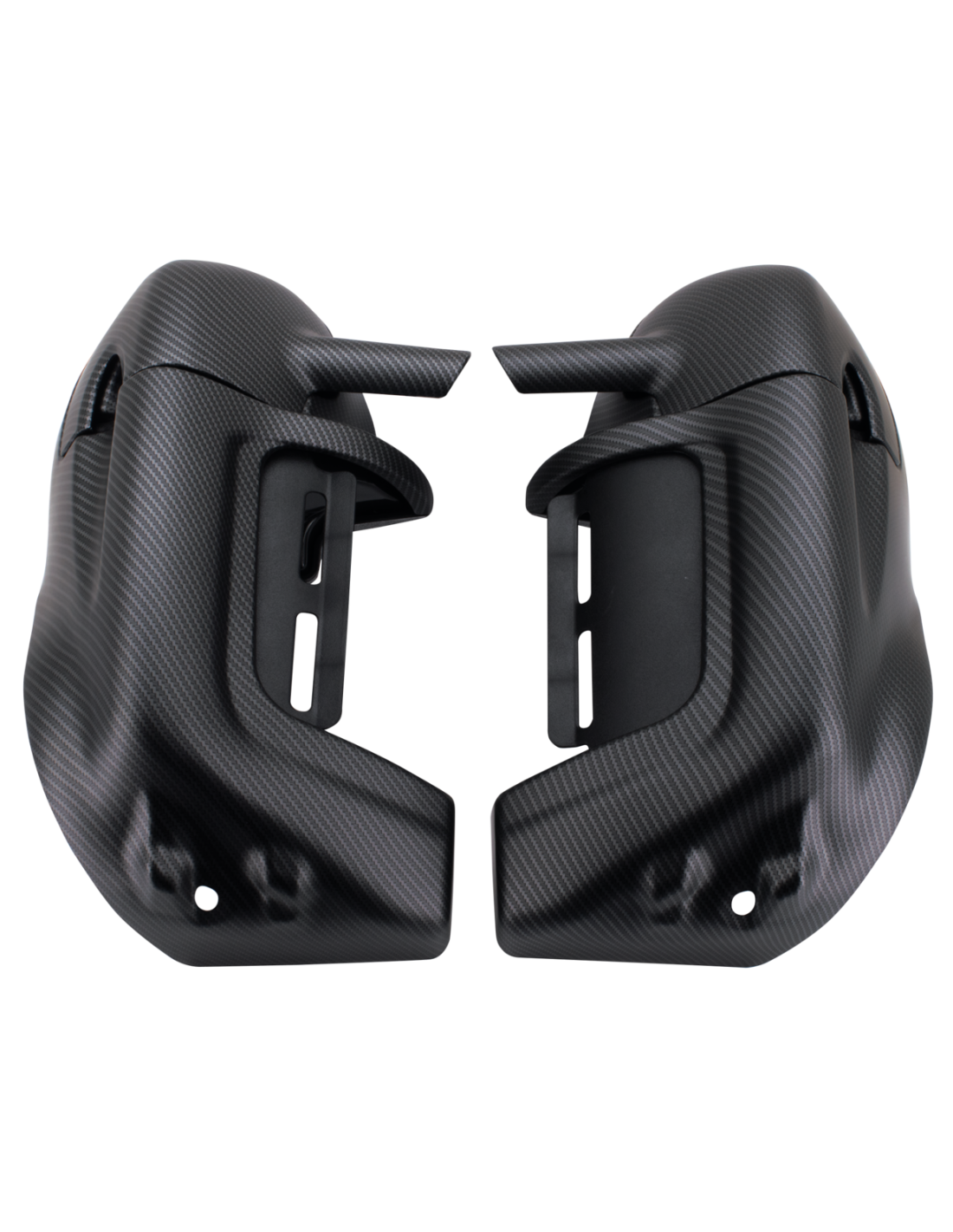 Carenature inferiori realizzati in ABS formato sottovuoto con finitura opaca o lucida in carbon look. Non solo proteggono il pilota dalle intemperie, ma indirizzano anche l'aria di raffreddamento verso il motore. Sono dotati di portaoggetti e si fissano direttamente al paramotore originale montato "straight top" con la minuteria di montaggio inclusa. Non si adattano ai paramotore Mustache o Chopped.