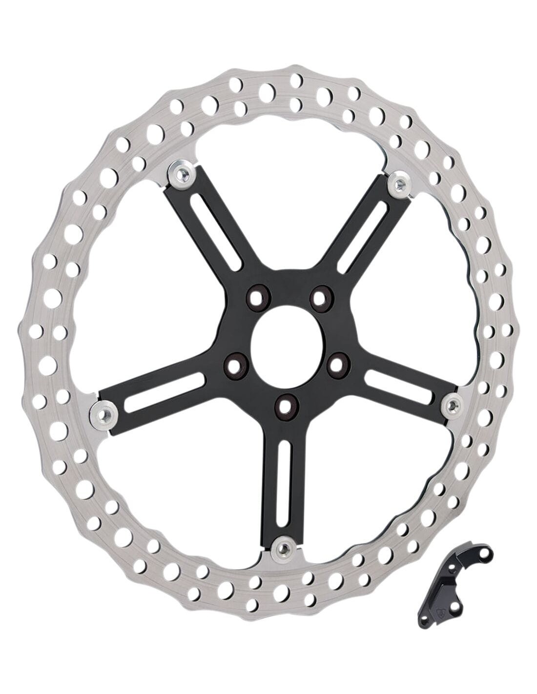 Kit disco freno flottante bordi seghettati big brakeforniscono fino al 30% di un potere frenante in più rispetto a dischi freno di serie o delle dimensioni di serie non solo aumenta le prestazioni, ma migliora anche lo stile del tuo cerchio di serie ogni kit include un disco freno flottante sovradimensionato da 15", una staffa adattatrice pinza freno e il materiale necessario per il montaggio cromato ideati per essere compatibili con steli forcella di fabbrica. Non compatibili con steli forcella arlen ness hot legs.