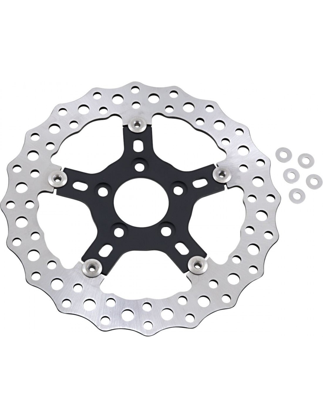 Disco freno flottante bordi seghettatidischi freno flottanti ad alte prestazioni concepiti per migliorare la prestazione di frenata e lo stile dei cerchi di serie in acciaio inossidabile 420, preforati per prestazioni ottimali e un'eccellente dissipazione del calore il rotore montato sul mozzo anteriore/posteriore da 11-1/2" è universale e si adatta a qualsiasi ruota harley davidson di fabbrica o aftermarket a 5 bulloni.