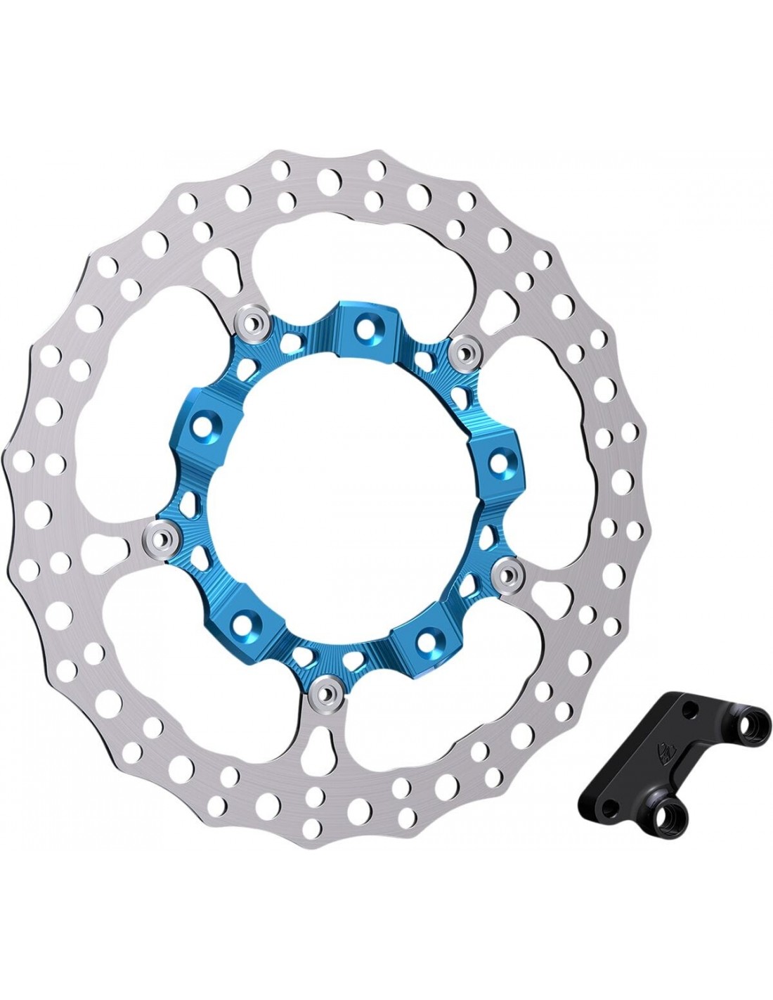 Kit disco freno flottante completo da 14" big brakekit disco freno grande da 14” con parte centrale lavorata in billet ciascun kit consente di migliorare nettamente le prestazioni di frenata e di aggiornare lo stile donando un tocco di anodizzato alla ruota anteriore di fabbrica ciascun disco freno completamente flottante presenta un disco esterno in acciaio inossidabile 420 forato per garantire le massime prestazioni e una parte centrale in billet 6061 adattatori pinza freno in billet inclusi in ogni kit per riposizionare correttamente la pinza freno di serie nella posizione prevista vengono utilizzati la pinza freno, il materiale per il montaggio del disco freno e il tubo freno di serie facile installazione a vite senza dover spurgare nuovamente il sistema frenante ciascun kit include disco freno da 14”, staffa adattatrice pinza freno e tutto il materiale per il montaggio ideati. Per adattarsi ai modelli touring flt hd con ruote di fabbrica dotate di freni dischi fissati sui raggi