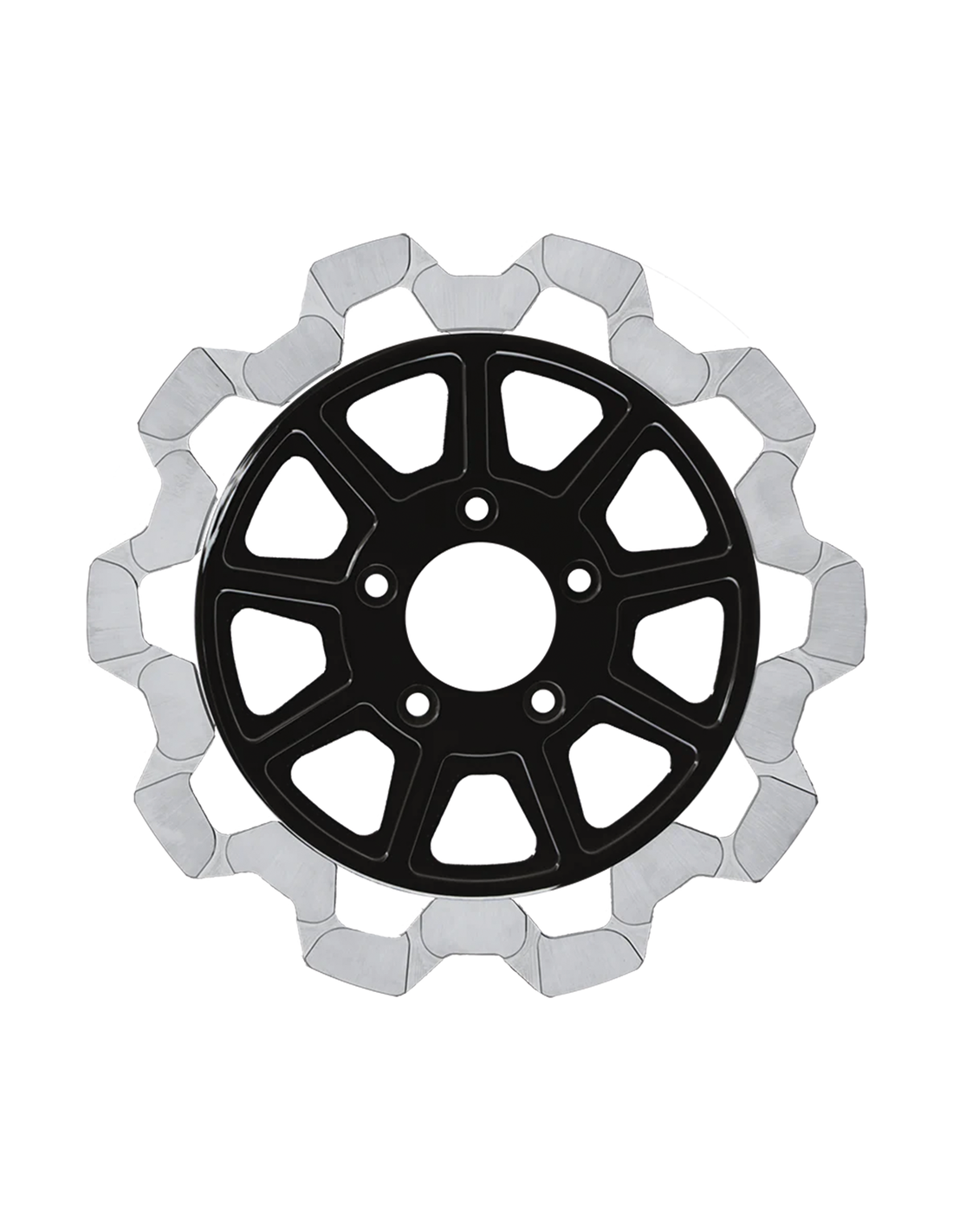 Lyndall BrakesPosteriore per Softail dal 2018 a oggiI dischi montati su mozzo hanno un diametro esterno di 11 1/2" (292mm), diametro interno 2 7/32" (56.4mm) e fori di montaggio scalinati da 5/16" con un pattern di 5x3,25" (82.6mm), Disegno-Bow Tie con centro nero e anello di attrito finito a macchina