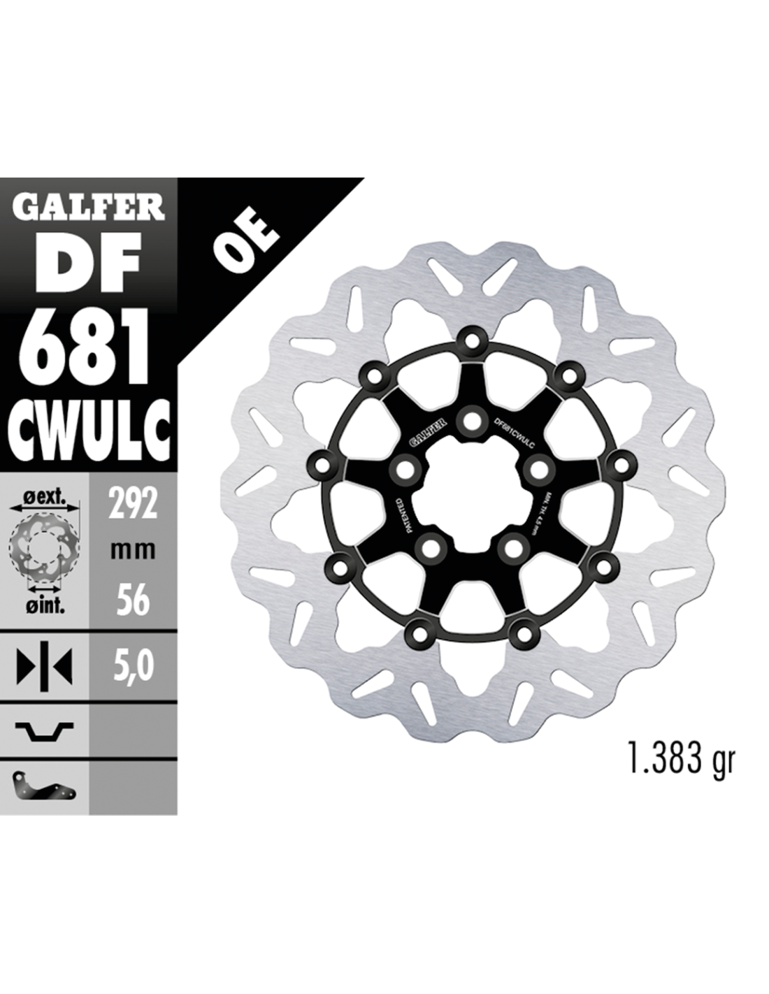 I dischi flottanti Galfer Wave offrono una frenata precisa ed efficiente e un notevole risparmio di peso. Se non diversamente indicato, sono dotati di nottolini in acciaio inox neri che fissano la pista frenante in acciaio inox alla parte centrale in alluminio. Sono utilizzabili con pinze di serie e di ricambio. Sono venduti singolarmente, ordinarne due per applicazioni a doppio disco. Come per ogni disco freno, si raccomanda vivamente di installare nuove pastiglie freno con un nuovo disco freno.