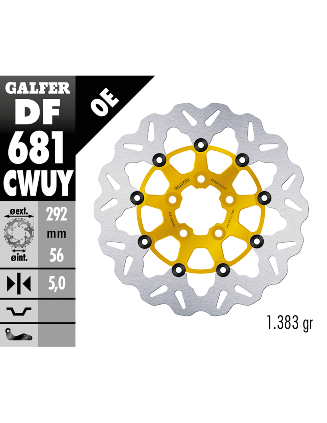 Galfer Performance BrakesI dischi flottanti Galfer Wave offrono una frenata precisa ed efficiente e un notevole risparmio di peso. Se non diversamente indicato, sono dotati di nottolini in acciaio inox neri che fissano la pista frenante in acciaio inox alla parte centrale in alluminio. Sono utilizzabili con pinze di serie e di ricambio. Sono venduti singolarmente, ordinarne due per applicazioni a doppio disco. Come per ogni disco freno, si raccomanda vivamente di installare nuove pastiglie freno con un nuovo disco freno.