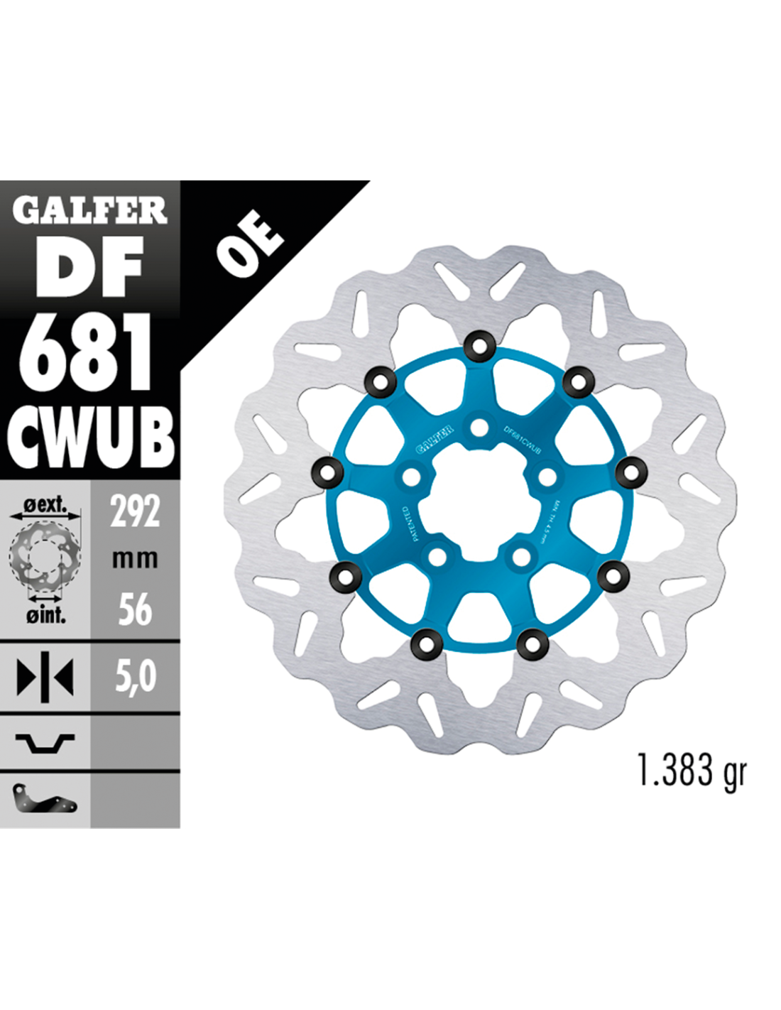 Galfer Performance BrakesPosteriore per Sportster 2000-2010, Touring 2000-2007, Dyna 2000-2017 e Softail 2000 a oggiIl disco montato su mozzo ha un diamentro esterno di 11 1/2" (292mm), diametro interno 2 7/32" e cinque fori scalinati da 3/8" su una circonferenza di 3 1/4", Disco flottante Wave, parte centrale blu