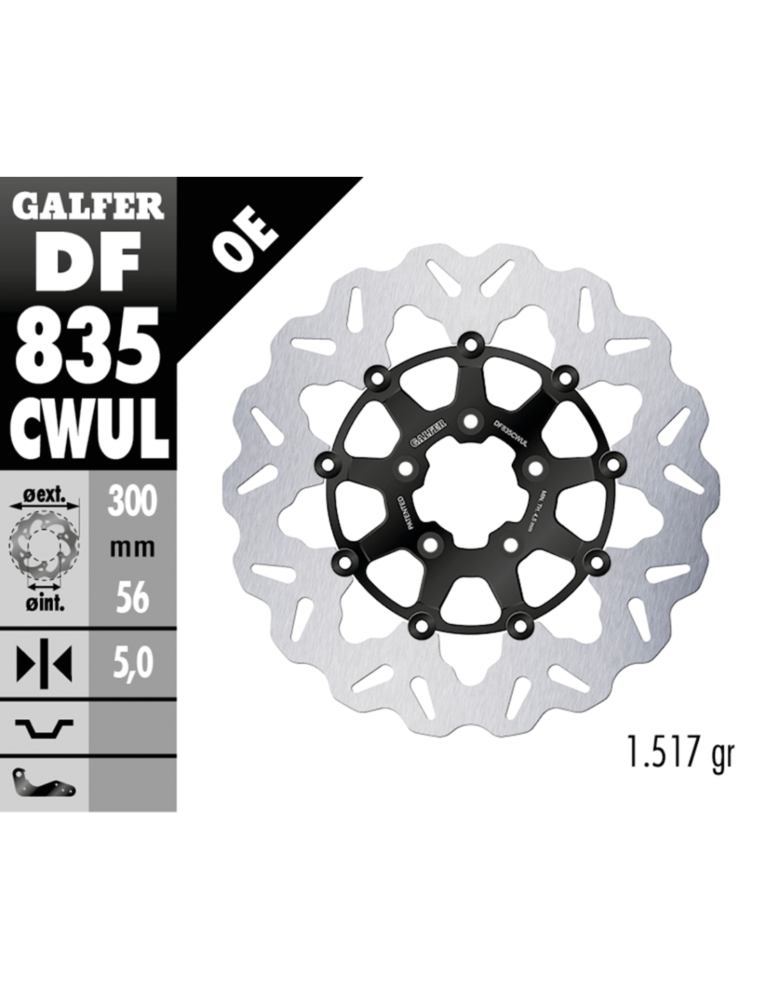 Galfer Performance BrakesAnteriore V-Rod 2007-2010 con cerchi a raggi, Dyna 2006-2007 con dischi montati su mozzo, Sportster 2014-2022, FLHR & FLHRC Road King 2008 a oggi, Touring 2008-2013 e Softail 2015 a oggiIl disco montato su mozzo ha un diamentro esterno di 11.8" (300mm), diametro interno 2 7/32" e cinque fori scalinati da 5/16" su una circonferenza di 3 1/4", Disco flottante Wave, parte centrale nera