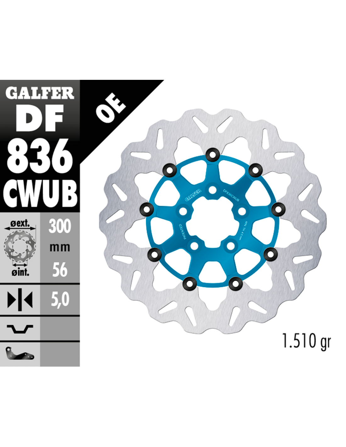 I dischi flottanti Galfer Wave offrono una frenata precisa ed efficiente e un notevole risparmio di peso. Se non diversamente indicato, sono dotati di nottolini in acciaio inox neri che fissano la pista frenante in acciaio inox alla parte centrale in alluminio. Sono utilizzabili con pinze di serie e di ricambio. Sono venduti singolarmente, ordinarne due per applicazioni a doppio disco. Come per ogni disco freno, si raccomanda vivamente di installare nuove pastiglie freno con un nuovo disco freno.