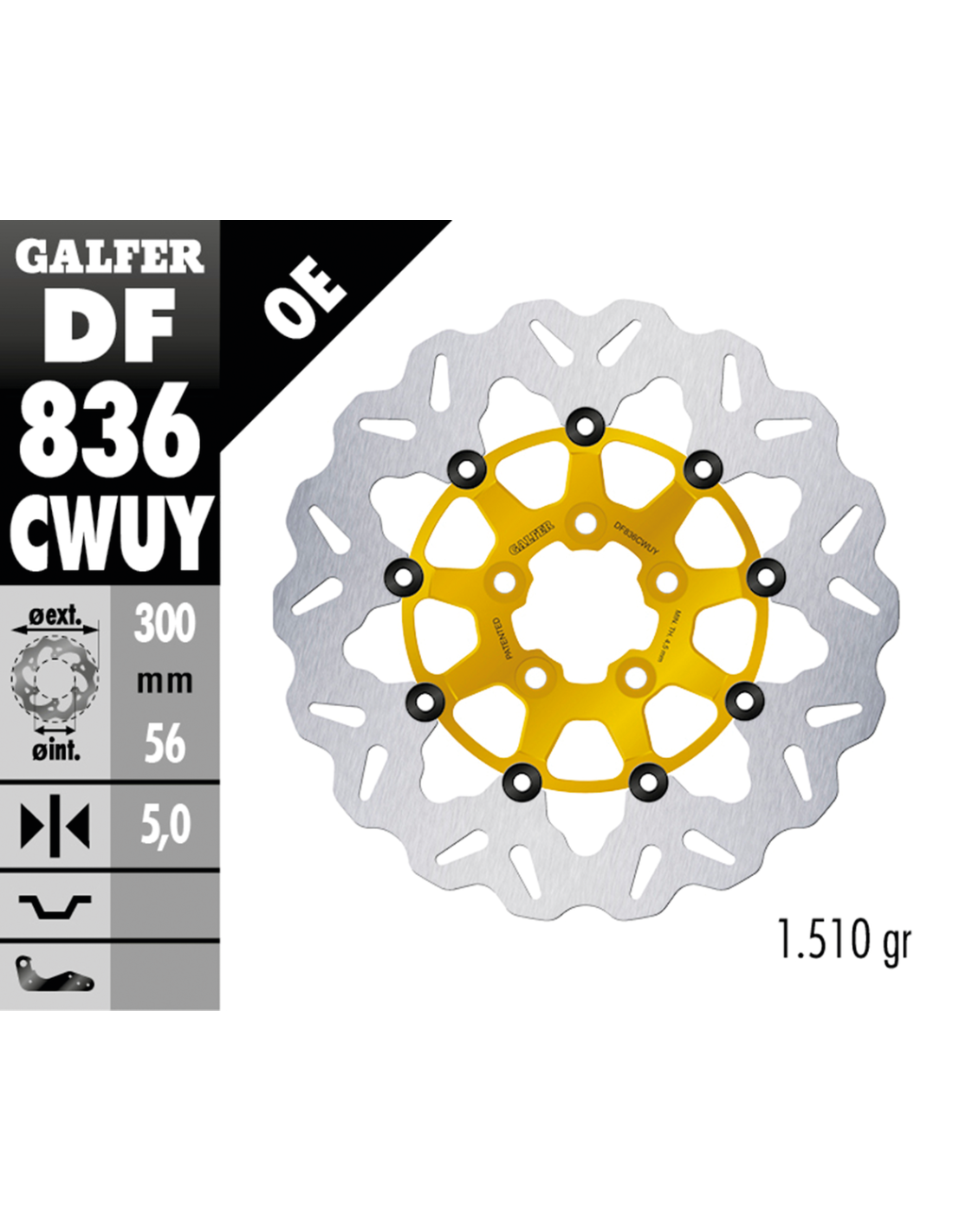I dischi flottanti Galfer Wave offrono una frenata precisa ed efficiente e un notevole risparmio di peso. Se non diversamente indicato, sono dotati di nottolini in acciaio inox neri che fissano la pista frenante in acciaio inox alla parte centrale in alluminio. Sono utilizzabili con pinze di serie e di ricambio. Sono venduti singolarmente, ordinarne due per applicazioni a doppio disco. Come per ogni disco freno, si raccomanda vivamente di installare nuove pastiglie freno con un nuovo disco freno.