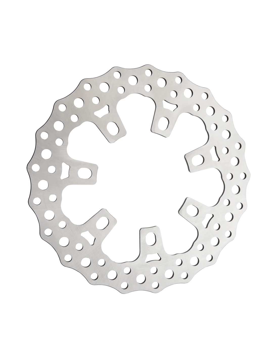 Dischi flottanti ad alte prestazioni progettati per migliorare le prestazioni di frenata e lo stile delle ruote di serie o aftermarket. Costruzione in acciaio inox 420 per impieghi gravosi, forati per ottimizzare le prestazioni e la dispersione del calore e realizzati per il peso delle moto V-Twin e Touring. Tutti i dischi sono venduti singolarmente. Si consiglia vivamente di installare i nuovi dischi freno con le nuove pastiglie. I dischi unidirezionali possono essere montati a destra o a sinistra,