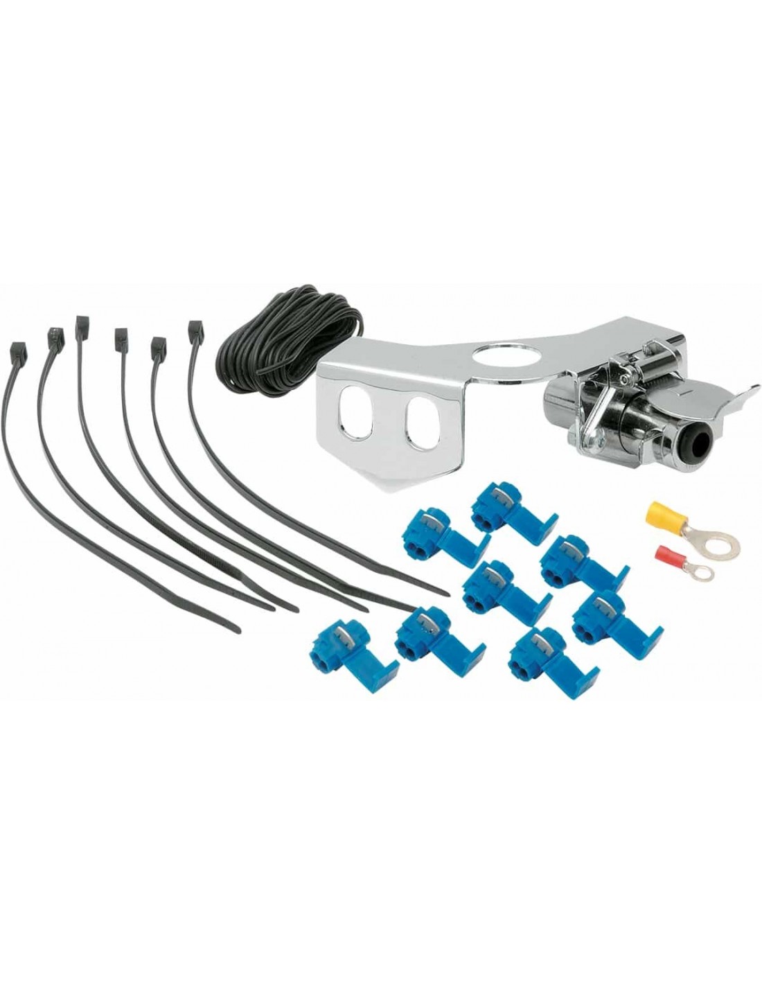 Kit presa gancio traino con attacco a sferaSi monta facilmente sul lato inferiore della sfera del gancio così da garantire un aspetto pulito e avere a disposizione un modo rapido per collegare/scollegare il cablaggio di illuminazione per rimorchio Il kit include una piastra di attacco cromato, attacco catena di sicurezza cromato, un connettore plug-in maschio/femmina a 5 poli e tutto il cablaggio e il materiale per il montaggio < li>Compatibile anche con ganci traino di altri marchi.
