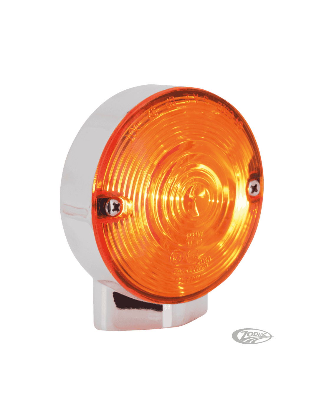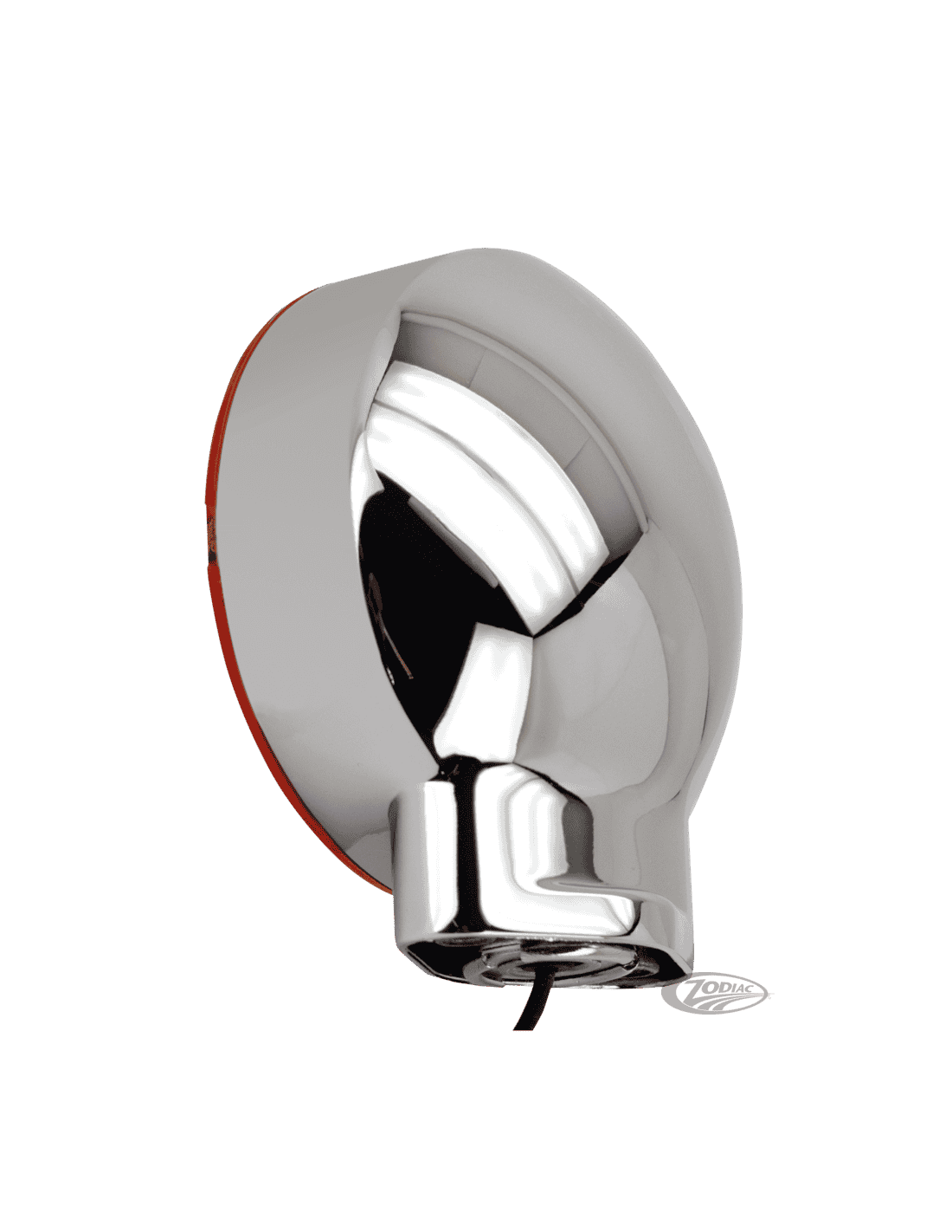 Zodiac (Genuine Zodiac Products)Questi fanali posteriori dall'aspetto classico approvati E, hanno l'illuminazione a LED per la luce posteriore, l'illuminzaione della targa e dello stop. Hanno l'alloggiamento in alluminio billet del diametro di 2 3/4" (7 cm). L'alloggiamento ha dei fori tondi o allungati sui lati. Quando la luce è accesa, è visibile da questi fori. Il fanale è fornito precablato e completo di portatarga in acciaio. Disponibile nero con tagli lucidati, cromato o ottonato.