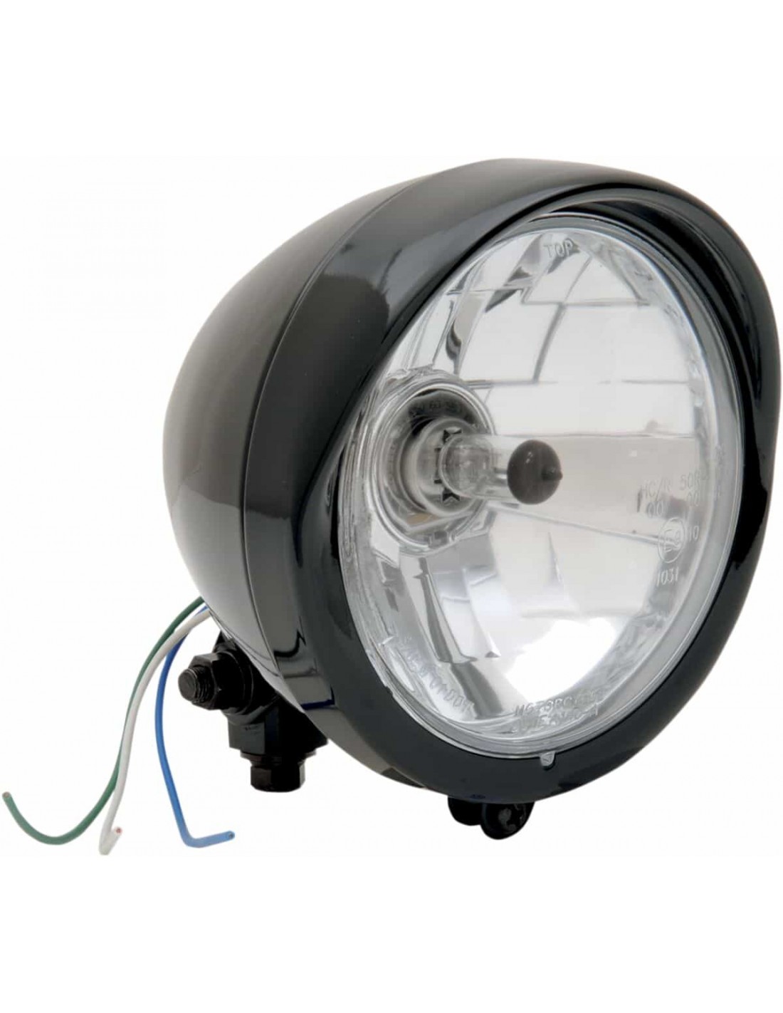 Drag SpecialtiesFari completi da 14,5 cm (5-3/4") con superficie parabola effetto diamante e attacco dal bassoStile classico con elementi moderni Forma per il montaggio dal basso, blocchetto di montaggio con finitura abbinata in dotazione Alloggiamento liscio, disponibile con ghiera semplice o con visiera Disponibile con lente trasparente o blu, per un fascio luminoso più bianco e chiaro Per lampadine standard H4 P43T