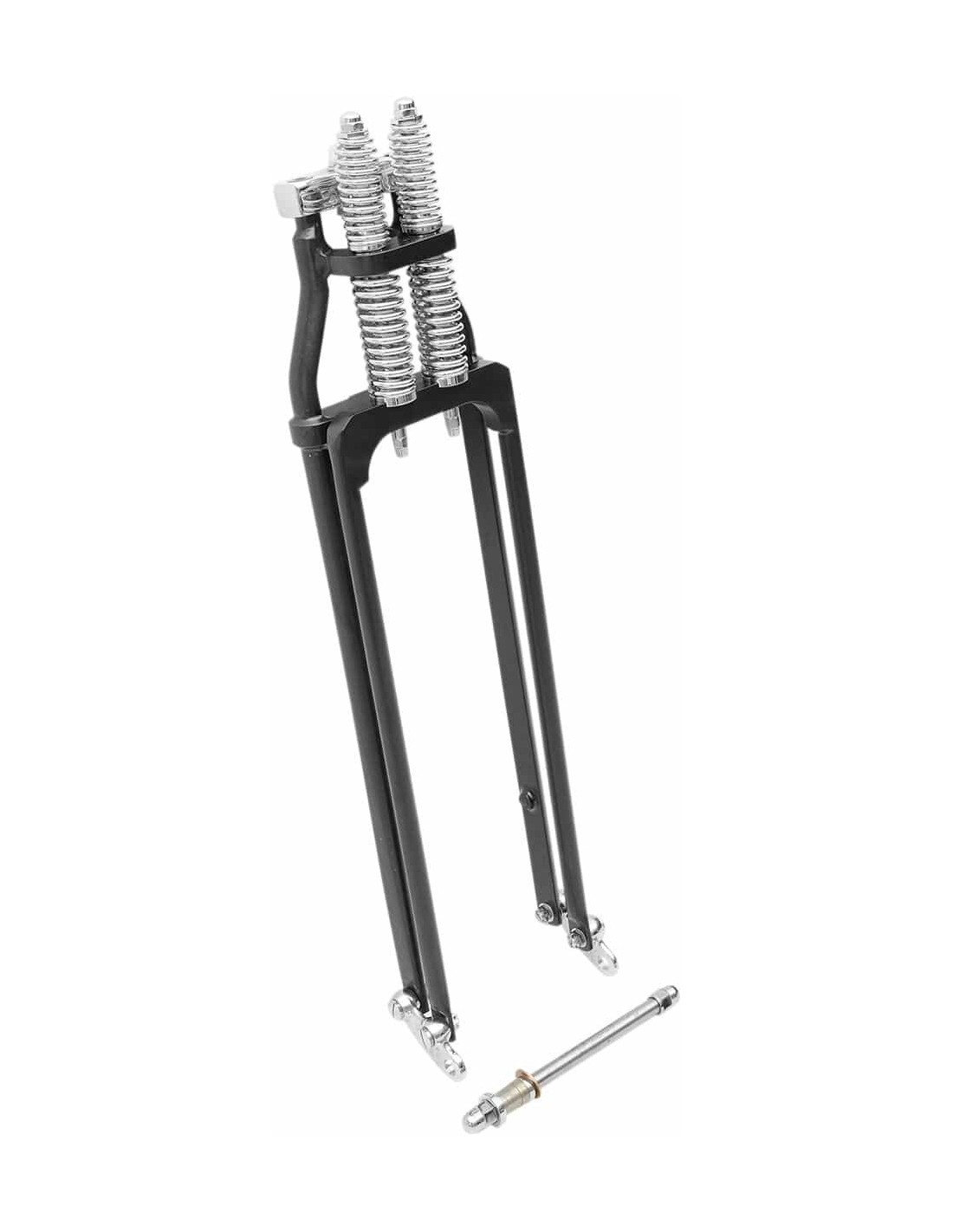 Forcelle Custom SpringerAlternativa economica a una forcella Springer con ammortizzatore Completamente assemblata con una staffa superiore e inclinazione pari a zero Cannotto di sterzo con diametro esterno di 1" ideato per cuscinetti di tipo Timken® Entrambi gli steli forcella posteriori sono filettati per i freni destro o sinistro Il kit perno ruota con diametro esterno di 3/ 4" include un perno attacco freno con rondella e distanziali mozzo (a seconda della ruota usata potrebbe essere necessari distanziali custom) Distanza di 9-1/4" tra le piastre forcella Gli attacchi riser presentano una distanza tra l'uno e l'altro di 4-3/4" e filettature di 1/2"-20 È necessario un cerchio compatibile con perno ruota con diametro esterno di 3 /4" Queste forcelle Springer sono state misurate dalla fine della piastra superiore al centro del perno ruota Le forcelle Springer non sono compatibili né con supporti parafango né con barre luci ausiliarie.< /li>La forcella Springer nella lunghezza standard (31” misurata dal cuscinetto superiore al perno ruota) è paragonabile a una forcella anteriore FXST di lunghezza standard.