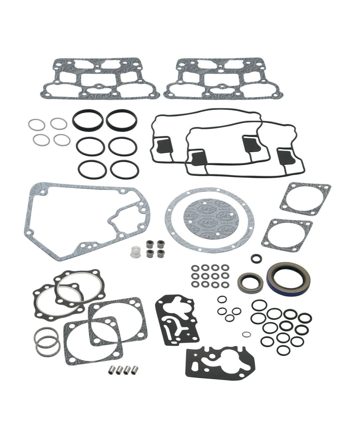 I kit S&S contengono tutte le guarnizioni ei paraoli necessari per la ricostruzione della parte superiore dei motori S&S o di qualsiasi motore che usi teste e cilindri S&S. Le guarnizioni dei coperchi bilancieri sono incluse meno dove menzionate diversamente.