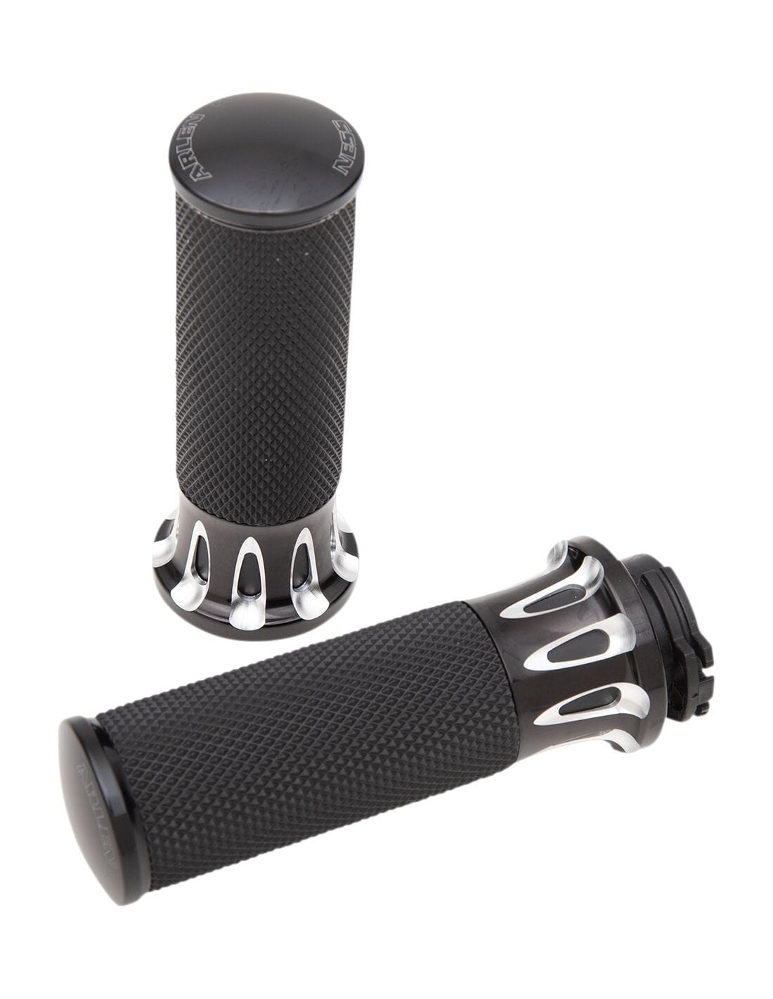 Manopole deep cut fusionogni manopola è offre un'aderenza straordinaria per la tua manogli inserti in alluminio billet sono finemente lavoraticaratterizzate da collarini interni in alluminio billet di 1-1/4”, manopole in gomma zigrinata con motivo a diamante e terminali in alluminio billettutte le manopole sono fornite con tubo comando gas installato, la colla per manopole e istruzioni semplici da seguirepoggiapiedi e pedalini coordinati sono disponibili separatamente