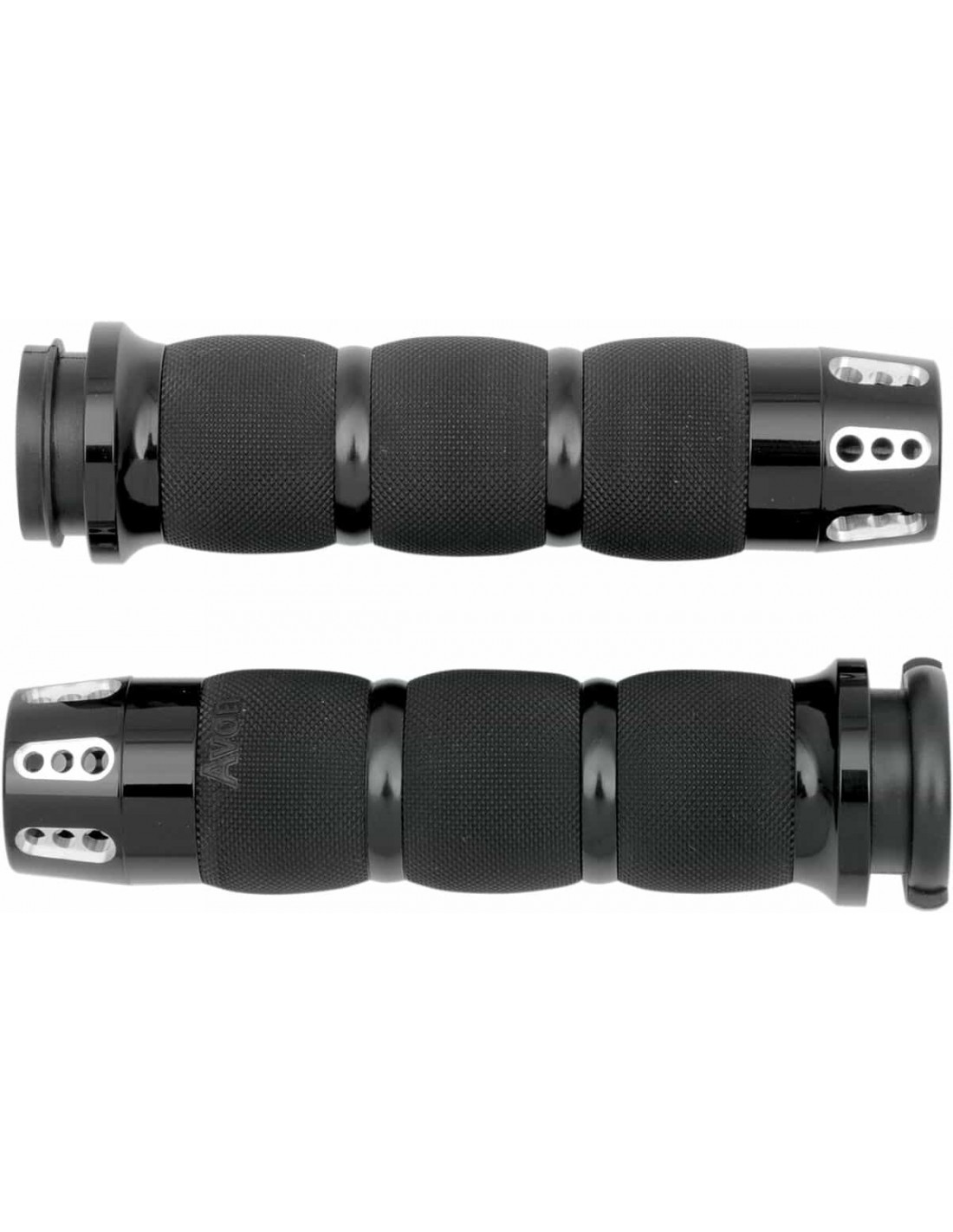 Manopola con cuscinetti d'aria GatlinCon terminali e anelli in alluminio billet e tecnologia di impugnatura in gomma senza giunzioni AVON Ideata con un materiale molto morbido, duraturo e duraturo ad azione viscosa Le manopole in stile Touring sono compatibili con manubri di 1", le manopole stile Superbike sono compatibili con manubri di 7/8" Made in USA
