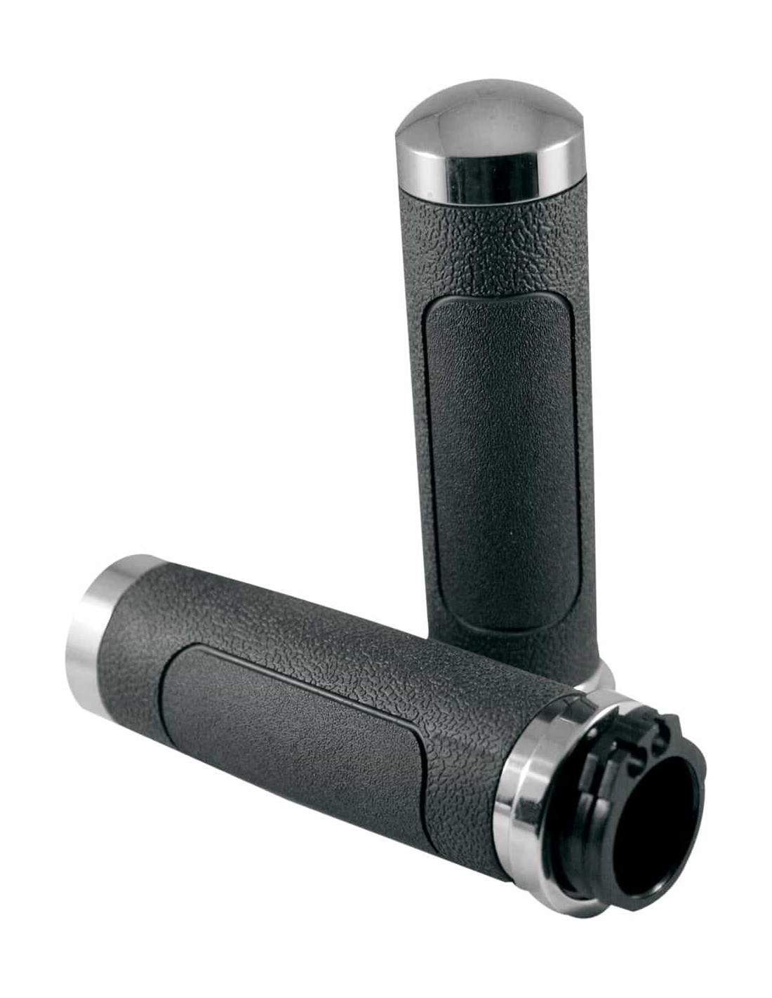 Manopole V-CruiserIn gomma KratonStile tradizionale Cruiser di alta qualitàStruttura in alluminio billet con tecnologia del rivestimento in gomma senza giunzioni AvonDoppia pelle pieno fiore per una manopola morbida ma al tempo resistenteMade in USATerminali e collarini in alluminio billet 6061< /br>