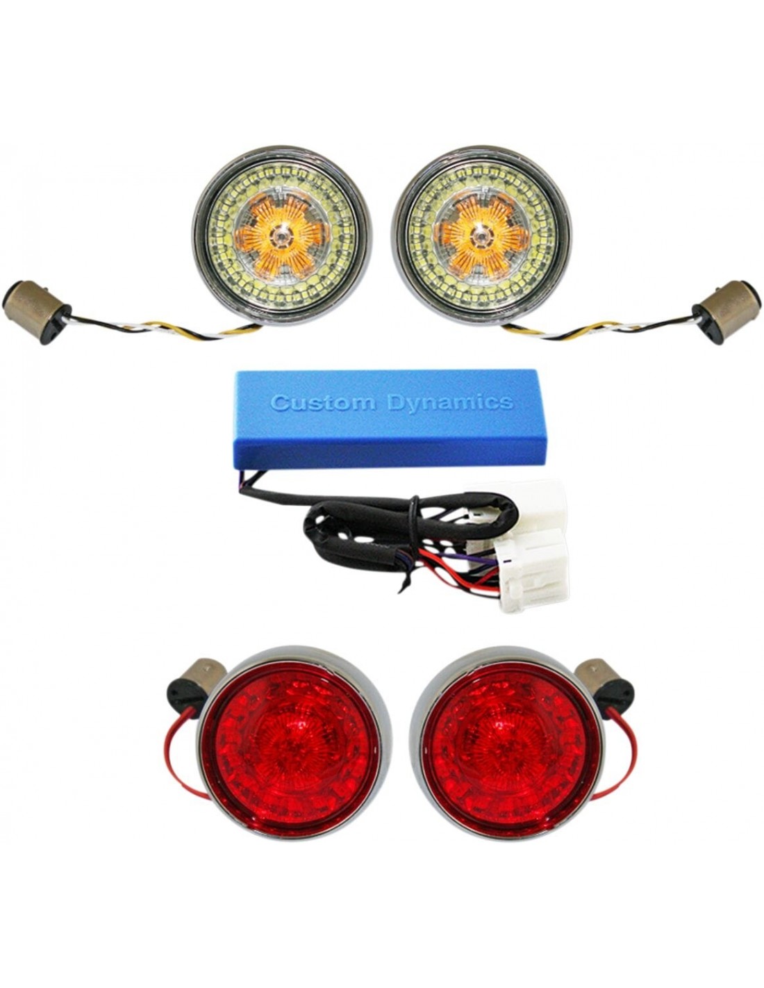 Kit di conversione per indicatori di direzione anteriori e posteriori con vetri dotati di ghiere bulgli inserti indicatori di direzione led probeam® ottimizzano le prestazioni con una tecnologia della parabola straordinaria ei led di qualità automobilistica migliori gli inserti utilizzano led di qualità automobilistica per produrre un fascio luminoso ancora più potente con un angolo visivo maggiore gli indicatori di direzione anteriori presentano un anello esterno composto da 24 led probeam® bianchi halo uniformi che funzionano come luce di marcia mentre i 12 led centrali di colore ambra fungono da indicatore di direzione gli indicatori di direzione posteriori presentano 24 led rossi probeam® di base 1156/ba15s per la massima visibilità li> le ghiere bullet aggiungono un tocco personalizzato di eleganza ai led probeam® omologazione dot e sae ringz™ anteriori dinamici ambra/bianchi probeam® 1157 indicatori di direzione posteriori rossi a led probeam® 1157 (modelli senza luce posteriore centrale)