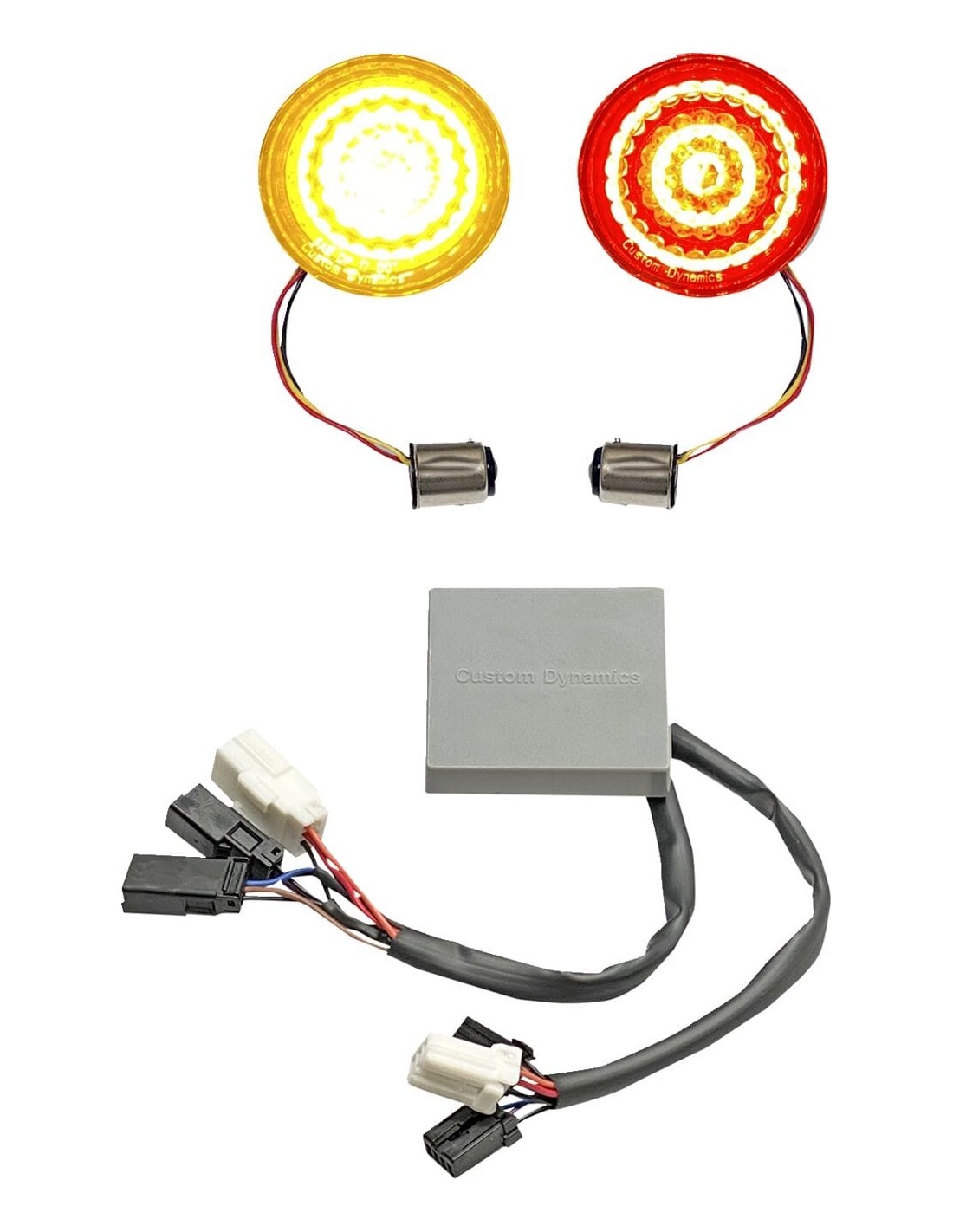 Custom DynamicsIndicatori di direzione bullet smart led 1157 con controller48 led bicolore rosso/ambra per unità per una luce di marcia rossa a cluster completo, luce di stop rossa brillante e luce di stop rossa brillante. Indicatore di direzione a led ambra a contrasto completo quando un indicatore di direzione viene attivato, i led rossi si spengono completamente per l'intero ciclo degli indicatori di direzione fornendo una maggiore visibilità all'indicatore di direzione color ambra le unità sono completamente sigillato con guarnizioni a tenuta stagna installazione plug and play sotto il sedile e fornisce 10 modelli di flash/strobo dei freni opzionali conforme dot/sae non adatto ai modelli internazionali o canadesi