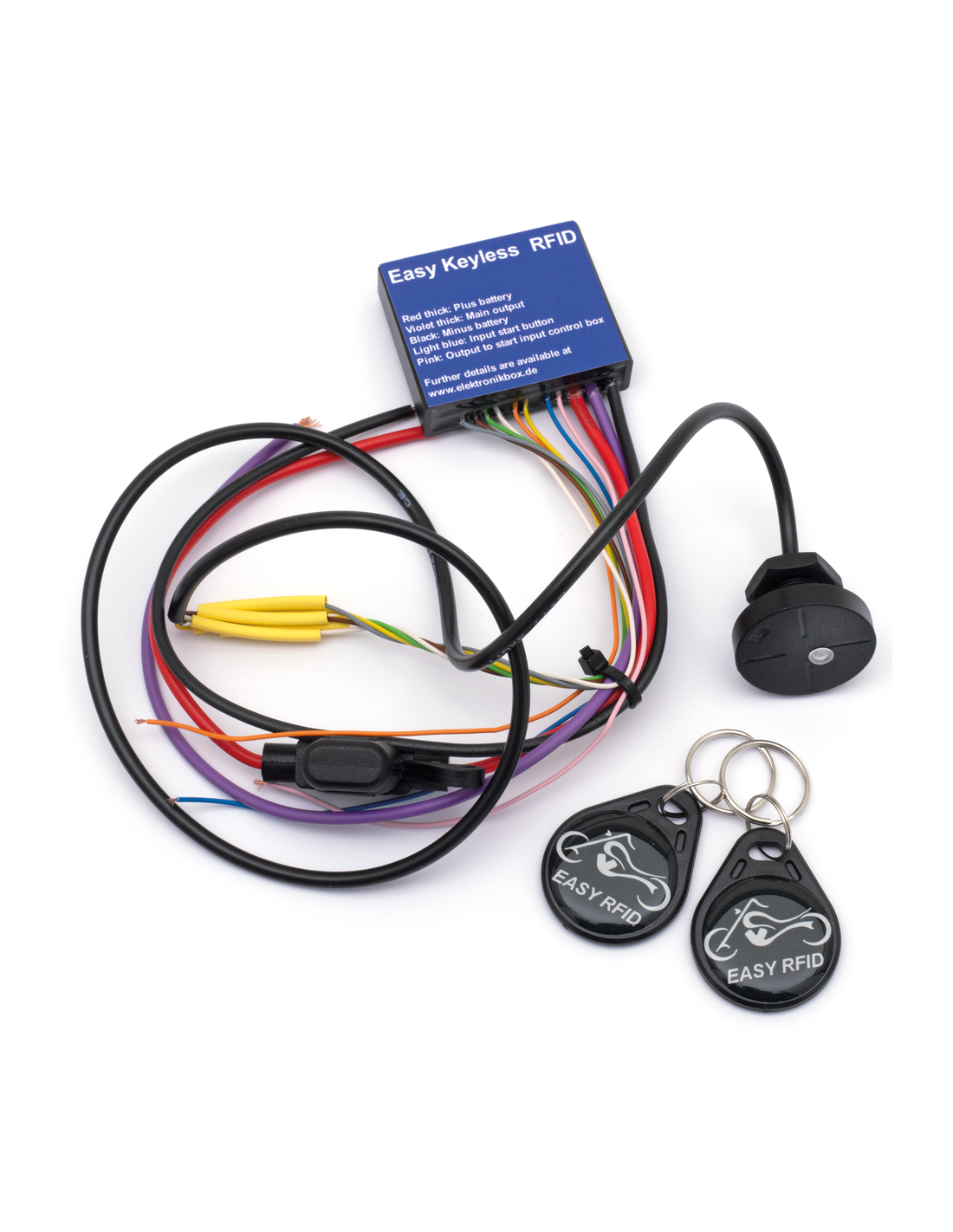 Queste soluzioni di interruttori di accensione senza chiave non assorbono quasi nessuna corrente in modalità standby e quindi risparmiano l'energia della batteria della moto, in modo da poterla avviare anche dopo mesi di inutilizzo. L'unità è dotata di due interruttori di carico da 20Amp che controllano l'alimentazione della moto e del motorino di avviamento. Il tutto viene gestito con un solo pulsante di commutazione. Premendo una volta il pulsante di commutazione si attiva l'alimentazione dell'unità di invio e, per la versione RFID, si accende automaticamente l'accensione se una chiave elettronica registrata si trova nel raggio d'azione. La versione Fingerprint si attiva quando viene riconosciuta l'impronta digitale. Premendo una seconda volta l'interruttore a pulsante si attiva il motorino di avviamento. Per disattivare l'accensione è sufficiente premere nuovamente l'interruttore a pulsante per spegnere l'unità. Easy RFID viene fornito con un'antenna e due tag RFID, mentre Easy FP viene fornito con un sensore di impronte digitali filettato da 25 mm. Se installato insieme a una centralina di controllo Elektronikbox, non è necessario collegare un pulsante aggiuntivo al modulo. Le unità sono dotate di un'uscita supplementare che simula la funzione di un pulsante di avviamento, consentendo di utilizzare il pulsante di avviamento originale della moto anche per l'attivazione del modulo. Viene fornito con un manuale di installazione completo.