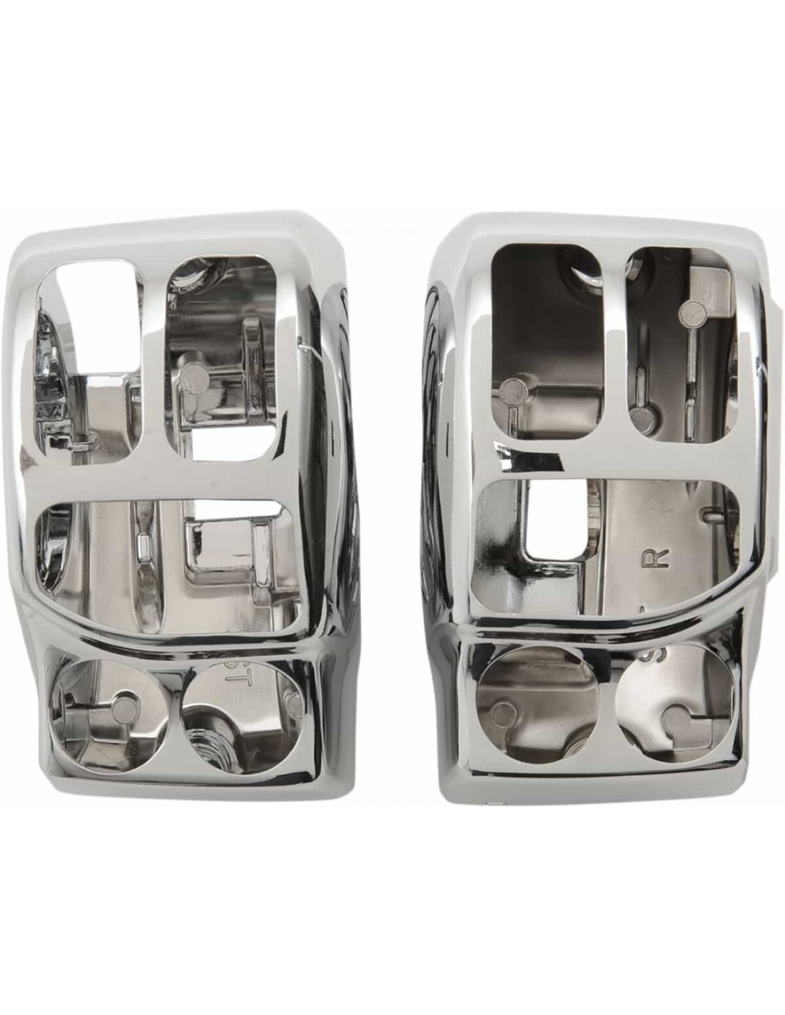 Kit alloggiamento interruttore manubrioCon comandi frizione e freno cromati Alloggiamenti per interruttori in alluminio pressofuso con bordi arrotondati, attacchi in stile OEM, parti superiori lisce e finitura cromata per un aspetto pulito Compatibili con cablaggio e interruttori in stile OEM Le pompe freno sono compatibili con i kit di riparazione in stile OEM e presentano lo spazio necessario per tutti i manubri di 1- 1/4” Interruttori disponibili separatamente I comandi freno/frizione e gli alloggiamenti per interruttori con attacchi in stile OEM sono venduti separatamente Attacchi interruttore cromati disponibili separatamente