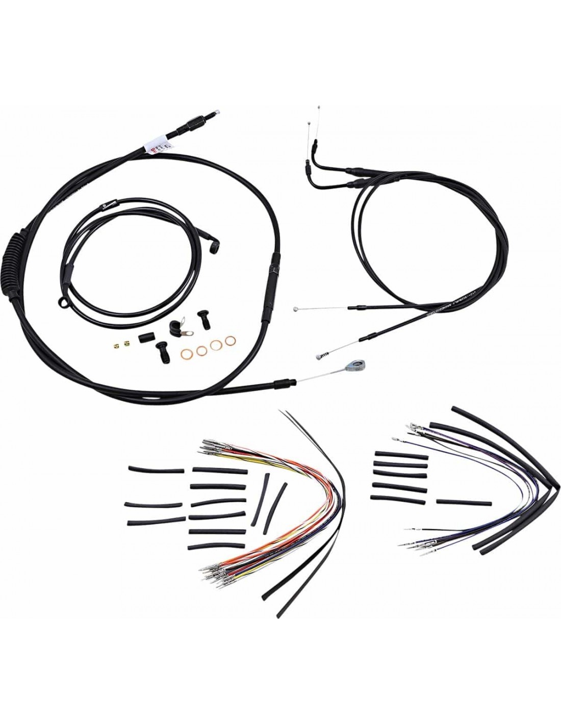 Burly BrandKit tubo/cavo manubrio completo in vinile per manubri Ape HangerKit di installazione completo per Burly Ape Hanger I kit includono tubo freno prolungato, cavo/tubo frizione prolungato , cavi comando gas di andata/ritorno prolungati come richiesto e tutto il cablaggio necessario I tubi freno, se inclusi, presentano un rivestimento interno in PTFE e una treccia esterna in acciaio inossidabile resistente I kit Dresser riutilizzano il cablaggio Ride-By-Wire di serie I kit si basano sull'utilizzo di rialzi da 2” con manubri in stile Ape Hanger Include tubo freno a disco singolo esteso in treccia metallica, cavo frizione estesa, cavi comando gas estesi e tutto il cablaggio necessario