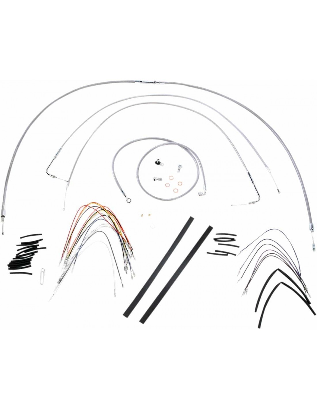 Burly BrandKit tubo freno/cavo manubrio intrecciato in acciaio inossidabile completoKit di installazione completo per Burly Ape Hanger I kit includono tubo freno prolungato, cavo/tubo frizione prolungato, cavi di comando/chiusura gas prolungati come richiesto e tutto il cablaggio necessario I tubi freno presentano un rivestimento interno in PTFE e una treccia esterna in acciaio inossidabile resistente I kit Dresser riutilizzano il cablaggio Ride-By-Wire di serie I kit si basano sull'utilizzo di rialzi da 2” con manubri in stile Ape Hanger