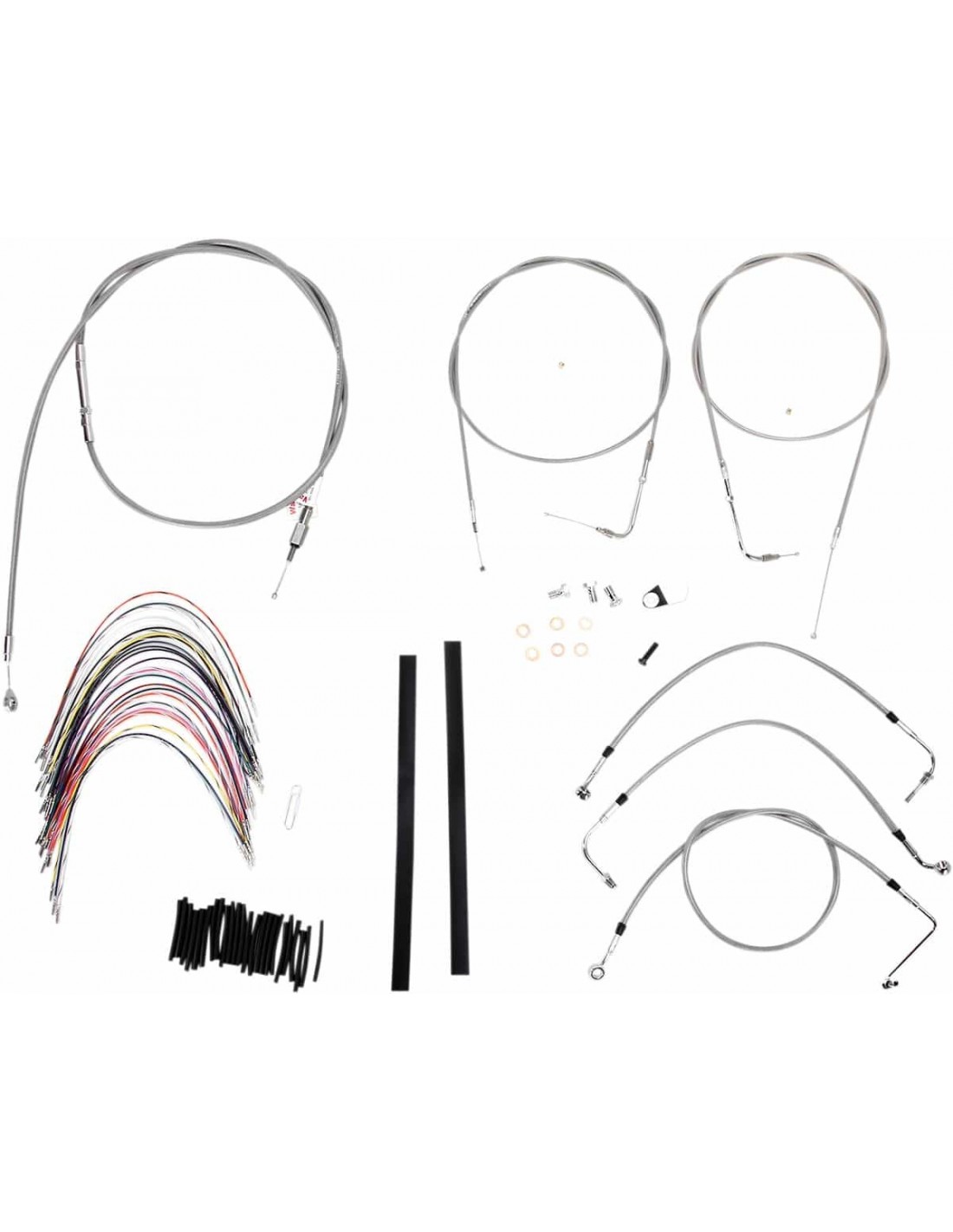 Burly BrandKit tubo freno/cavo manubrio intrecciato in acciaio inossidabile completoKit di installazione completo per Burly Ape Hanger I kit includono tubo freno prolungato, cavo/tubo frizione prolungato, cavi di comando/chiusura gas prolungati come richiesto e tutto il cablaggio necessario I tubi freno presentano un rivestimento interno in PTFE e una treccia esterna in acciaio inossidabile resistente I kit Dresser riutilizzano il cablaggio Ride-By-Wire di serie I kit si basano sull'utilizzo di rialzi da 2” con manubri in stile Ape Hanger