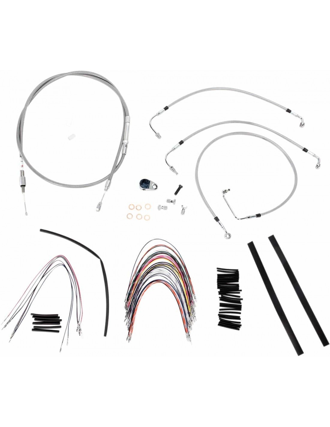 Burly BrandKit tubo freno/cavo manubrio intrecciato in acciaio inossidabile completoKit di installazione completo per Burly Ape Hanger I kit includono tubo freno prolungato, cavo/tubo frizione prolungato, cavi di comando/chiusura gas prolungati come richiesto e tutto il cablaggio necessario I tubi freno presentano un rivestimento interno in PTFE e una treccia esterna in acciaio inossidabile resistente I kit Dresser riutilizzano il cablaggio Ride-By-Wire di serie I kit si basano sull'utilizzo di rialzi da 2” con manubri in stile Ape Hanger