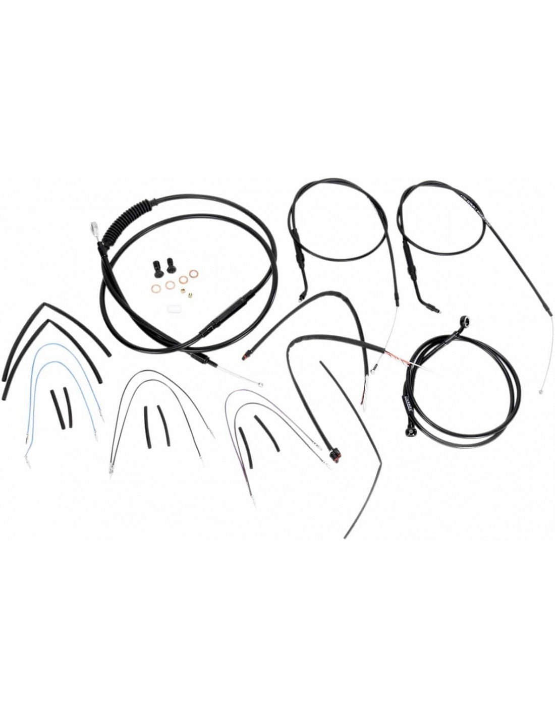 Burly BrandKit tubo/cavo manubrio completo in vinile per manubri Ape HangerKit di installazione completo per Burly Ape Hanger I kit includono tubo freno prolungato, cavo/tubo frizione prolungato , cavi comando gas di andata/ritorno prolungati come richiesto e tutto il cablaggio necessario I tubi freno, se inclusi, presentano un rivestimento interno in PTFE e una treccia esterna in acciaio inossidabile resistente I kit Dresser riutilizzano il cablaggio Ride-By-Wire di serie I kit si basano sull'utilizzo di rialzi da 2” con manubri in stile Ape Hanger Include tubo freno a disco singolo esteso in treccia metallica, cavo frizione estesa, cavi comando gas estesi e tutto il cablaggio necessario