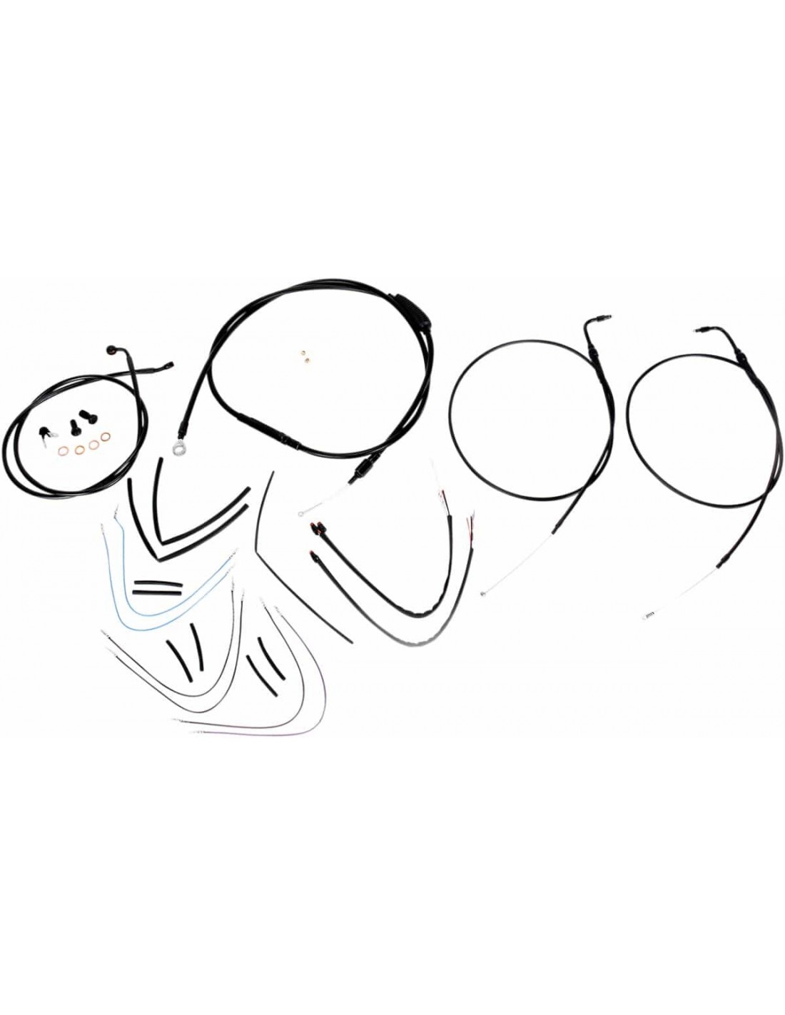 Burly BrandKit tubo/cavo manubrio completo in vinile per manubri Ape HangerKit di installazione completo per Burly Ape Hanger I kit includono tubo freno prolungato, cavo/tubo frizione prolungato , cavi comando gas di andata/ritorno prolungati come richiesto e tutto il cablaggio necessario I tubi freno, se inclusi, presentano un rivestimento interno in PTFE e una treccia esterna in acciaio inossidabile resistente I kit Dresser riutilizzano il cablaggio Ride-By-Wire di serie I kit si basano sull'utilizzo di rialzi da 2” con manubri in stile Ape Hanger Include tubo freno a disco singolo esteso in treccia metallica, cavo frizione estesa, cavi comando gas estesi e tutto il cablaggio necessario