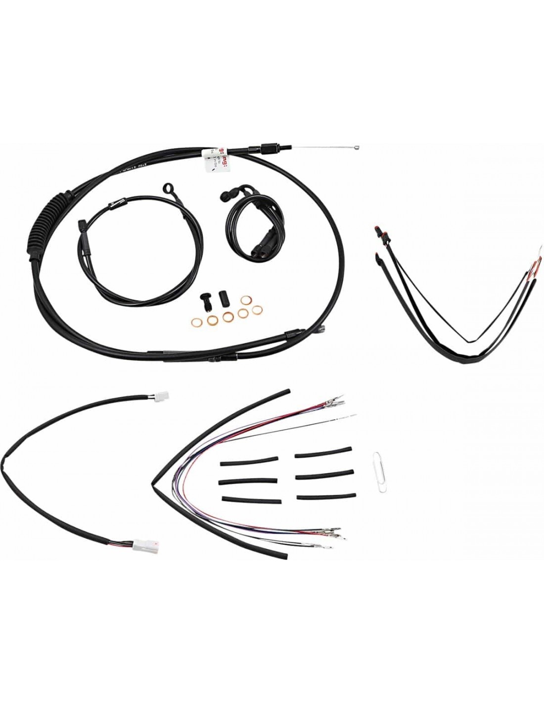 Burly BrandKit tubo/cavo manubrio completo in vinile per manubri Ape HangerKit di installazione completo per Burly Ape Hanger I kit includono tubo freno prolungato, cavo/tubo frizione prolungato , cavi comando gas di andata/ritorno prolungati come richiesto e tutto il cablaggio necessario I tubi freno, se inclusi, presentano un rivestimento interno in PTFE e una treccia esterna in acciaio inossidabile resistente I kit Dresser riutilizzano il cablaggio Ride-By-Wire di serie I kit si basano sull'utilizzo di rialzi da 2” con manubri in stile Ape Hanger Per modelli senza ABS.