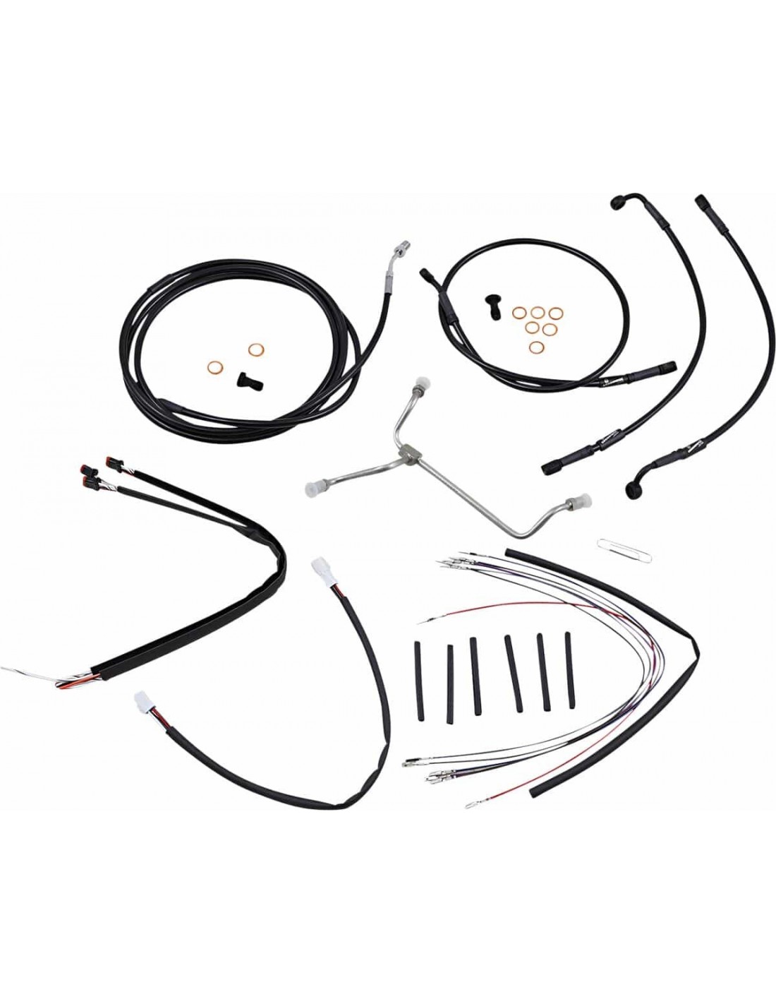 Burly BrandKit tubo/cavo manubrio completo in vinile per manubri Ape HangerKit di installazione completo per Burly Ape Hanger I kit includono tubo freno prolungato, cavo/tubo frizione prolungato , cavi comando gas di andata/ritorno prolungati come richiesto e tutto il cablaggio necessario I tubi freno, se inclusi, presentano un rivestimento interno in PTFE e una treccia esterna in acciaio inossidabile resistente I kit Dresser riutilizzano il cablaggio Ride-By-Wire di serie I kit si basano sull'utilizzo di rialzi da 2” con manubri in stile Ape Hanger