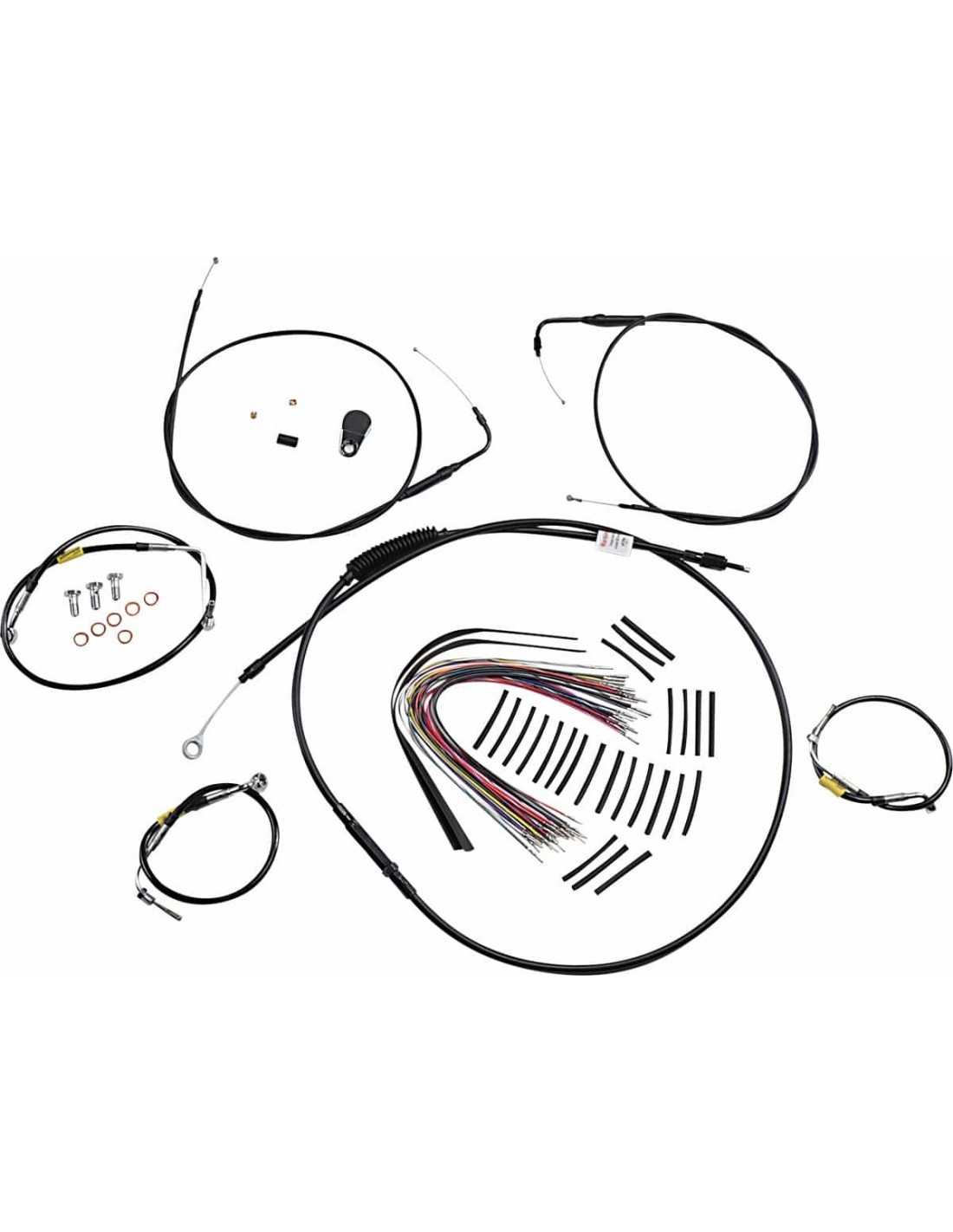 Burly BrandKit di controllo per prime moto touring con manubrio a barra baggerCiascun kit include un tubo freno esteso in modo specifico alla lunghezza del manubrio, un tubo frizione estesa e cablaggio esteso, così come tutti i componenti necessari per installare i manubri sul tuo modello touring Harley-Davidson